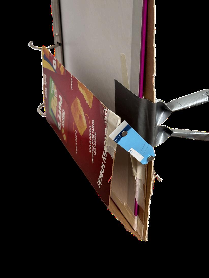 - hinge made of a bend giant paperclip in cardboard - on the left side instead to not interfere with papers