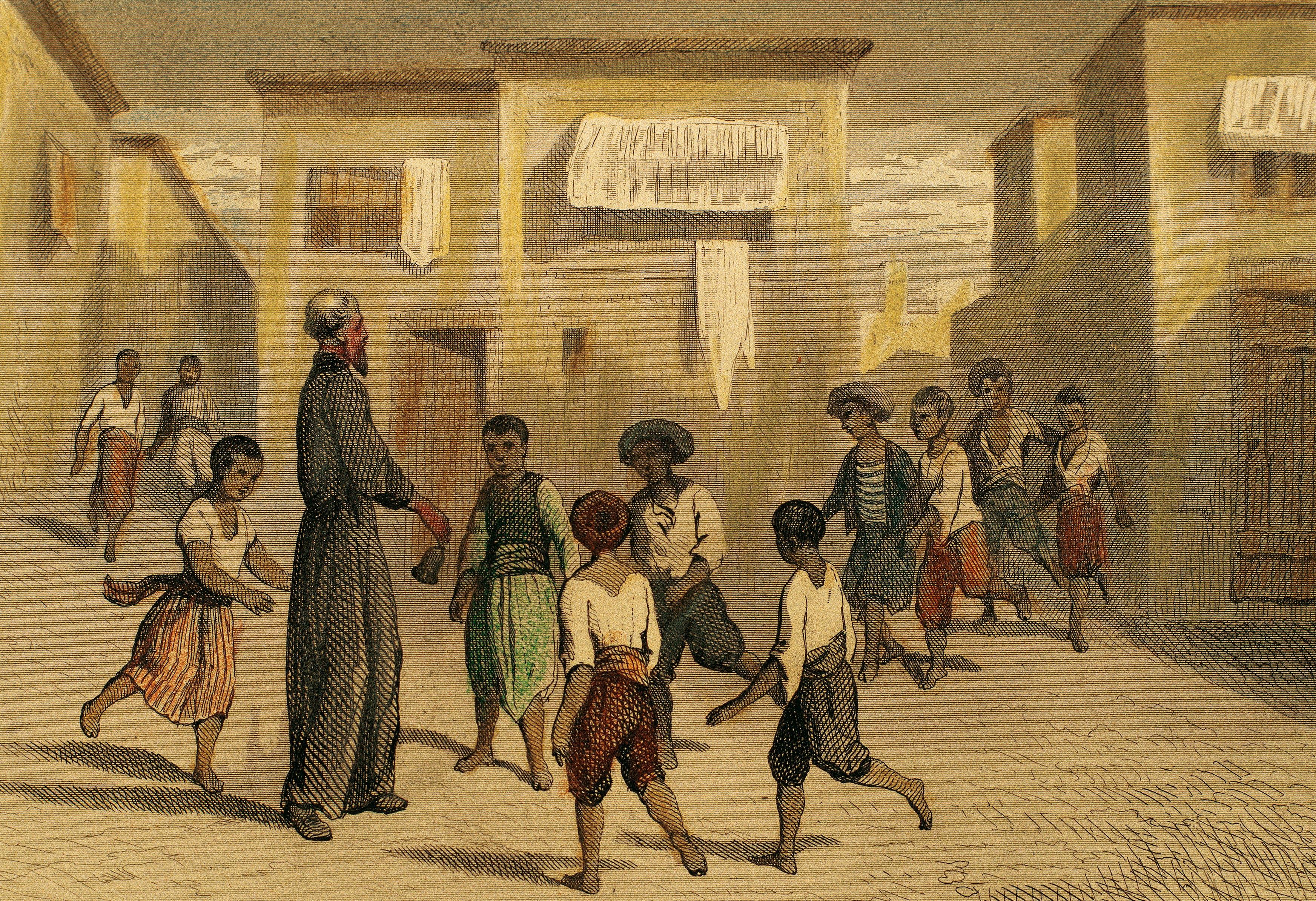 Saint Francis Xavier (1506-1552), Spanish missionary, through the streets of the Portuguese colony of Goa in 1542; French engraving, 1850