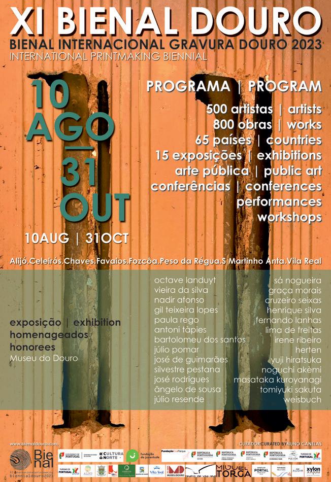 Bienal internacional de Gravura do Douro 2023, com a participação de 500 artistas, 800 obras, 65 países, arte pública, conferências, performances e workshops, distribuídas por oito (8) localidades. Curadoria de Nuno Canelas.