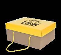 • Cartone micro onda fondo avana con coperchio • Manico in fettuccia di cotone dorato