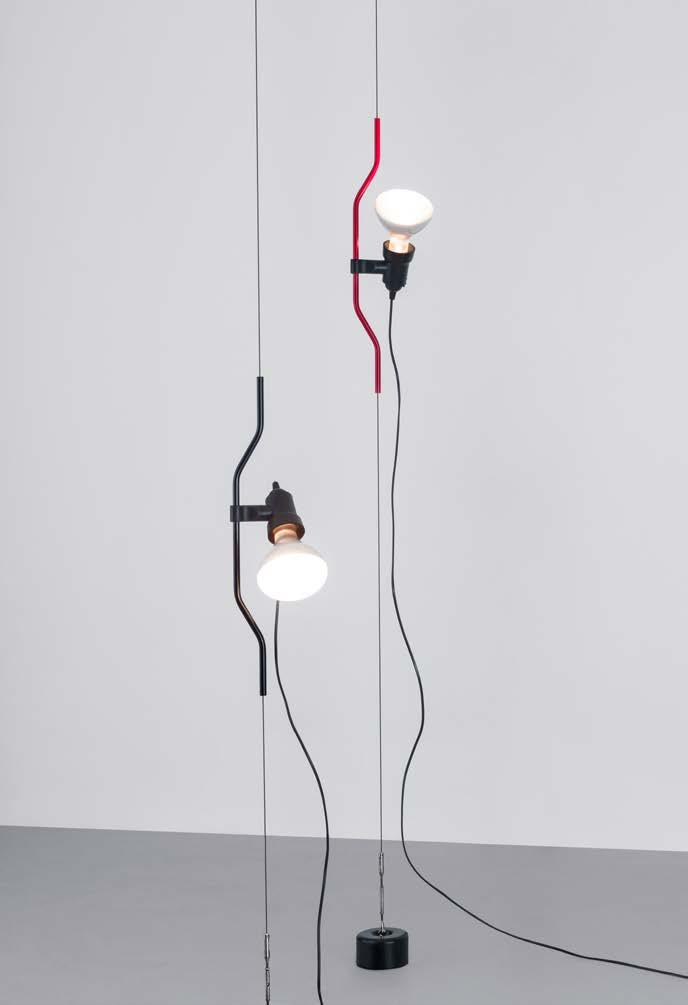A sinistra: Lampada adatta a molteplici usi e collocazioni: può essere posizionata su un tavolo, collocata a terra o sospesa, grazie alla pratica maniglia che assolve anche la funzione di avvolgicavo.
