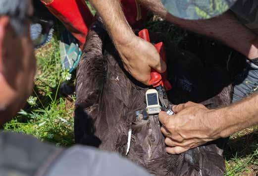 Hristo Peshev, ebenfalls von FWFF, wagt sich ohne Bedenken (und Schutzkleidung) in die Voliere, packt beherzt zu und kommt mit einem der großen Vögel auf dem Arm wieder heraus. Beringt wurde das Tier bereits als Küken in Spanien, doch bevor es nun in die Freiheit entlassen wird, erhält es noch einen GPS-Sender. „Wir wollen wissen, was aus unseren Geiern wird“, sagt Hristo, während er mit geübten Handgriffen den Sender auf dem Rücken des Vogels montiert. „Halten sie sich überwiegend in den Grenzen des Naturparks auf oder unternehmen sie weite Wanderungen? Außerdem verraten die Sender uns, wenn ein Geier verendet ist – und was die Ursache seines Ablebens war“, so der Ornithologe.