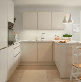 Satin-Lack-Fronten und der Arbeitsplatte in Sandstein-Nachbildung, unterstreichen die gemütliche, vertraute Atmosphäre.