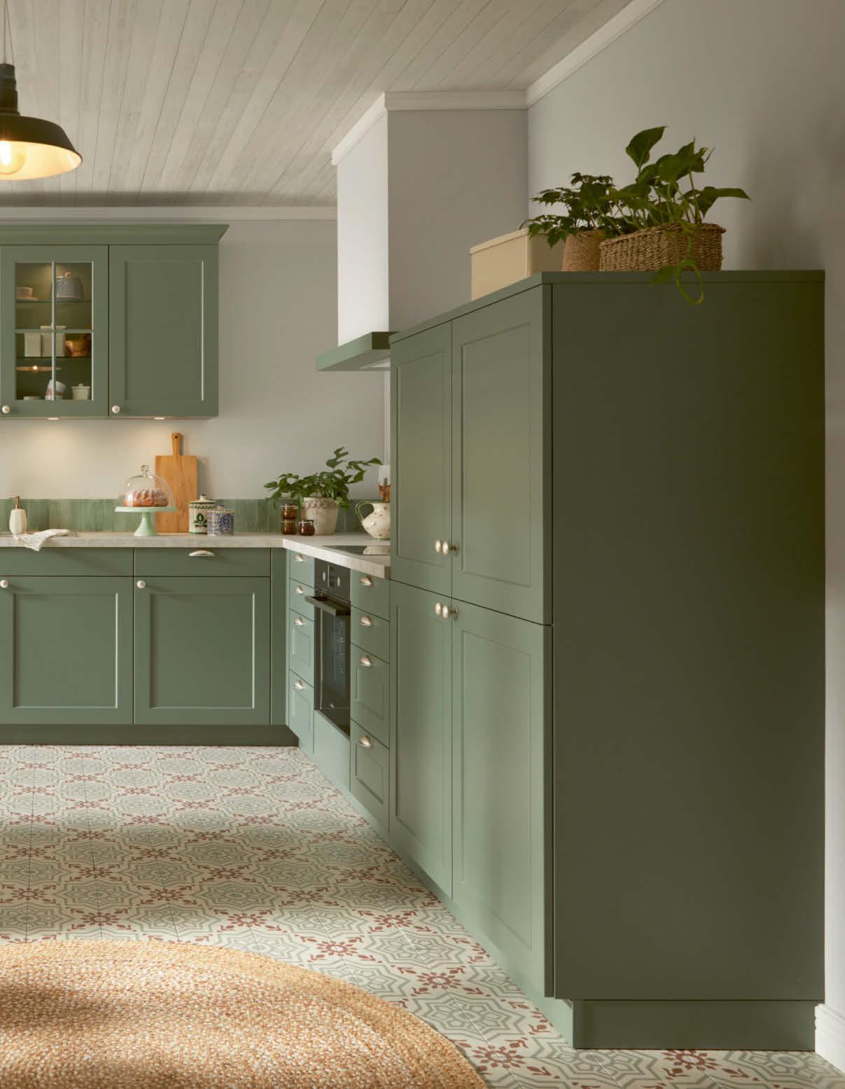 In dieser stilvoll eleganten Küche fühlst du dich zuhause. Hier zauberst du Köstlichkeiten für deine Lieben – mit neuen und auch alten Rezepten, die seit Generationen in deiner Familie weitergegeben werden. Der konsequent umgesetzte Landhausstil bleibt über Jahrzehnte aktuell, wirkt immer modern. Die warmen Farben, hier mit eukalyptusgrünen