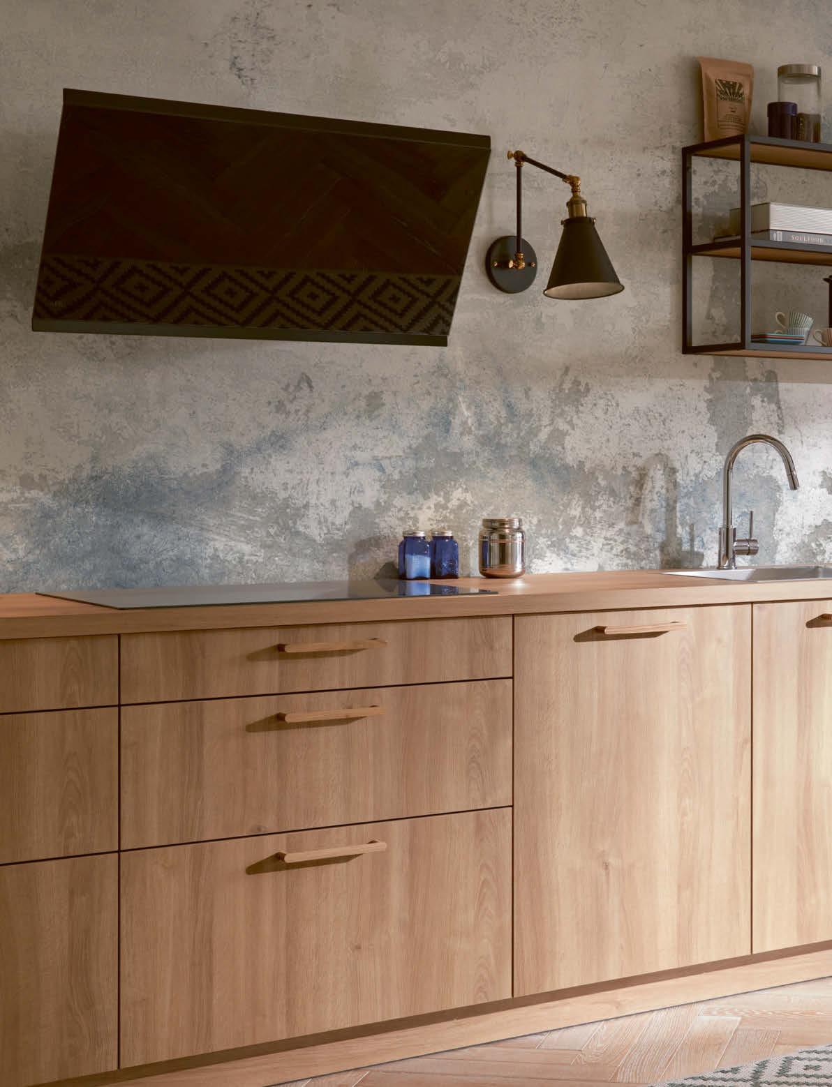 Deine Küche ist Ausdruck deines Lebensstils – durchdacht, individuell und mit Gespür für Design. Hier treffen rauer Putz auf warme Holztöne und ausgesuchte Vintage-Elemente auf elegant-robuste Fronten in Tiefblau. Die Oberfächen in Holzoptik sehen nicht nur aus wie echtes Holz, sie fühlen sich auch so an. Schwarze Frame-Racks mit passenden Einlegeböden setzen deine Lieblingsstücke stilvoll in Szene. So hast du alles im Blick und das, was du täglich brauchst, immer griffbereit.
