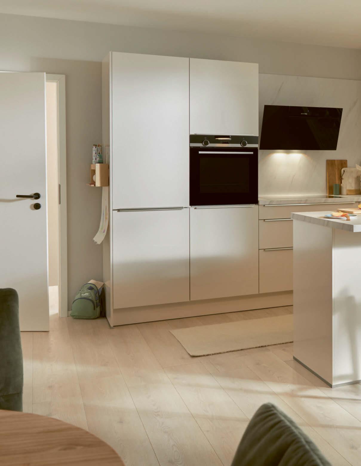 Das durchdachte Zusammenspiel von unterschiedlichen, sorgfältig aufeinander abgestimmten Materialien und Farben macht deine Küche zu einem echten Highlight. Die samtmatten Lackfronten mit ihren abgerundeten Kanten sind umlaufend lackiert.