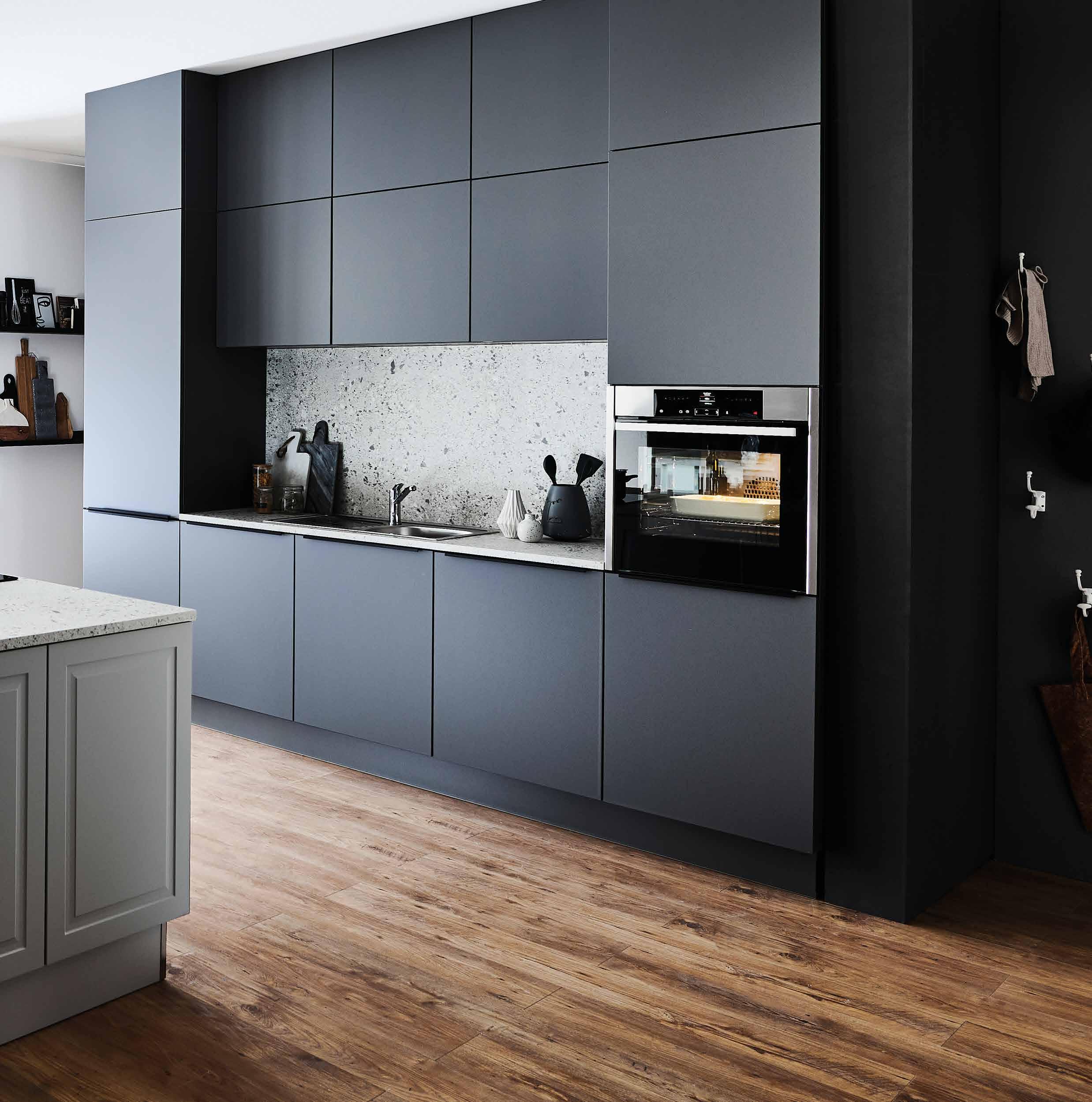 Küchenkombination KA 42.170 und KA 43.220 Quarzgrau Softmatt und Platingrau Softmatt, Nischenrückwand und Arbeitsplatte in Terazzo Bianco Nachbildung, Griffe Schwarz, Maße ca. 300 + 184 cm. Ausgestattet mit Neff Elektrogeräten: Backofen B15CR22N1 (EEK* A+, in einer Skala von A+++ bis D), Muldenlüfter T46CB4AX2 (EEK* B, in einer Skala von A+++ bis D), Kühlschrank KI1211SE0 (EEK* E, in einer Skala von A bis G).