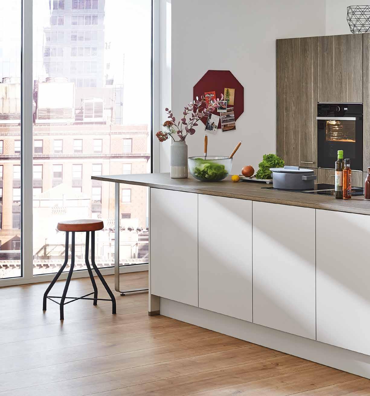 Küchenfronten in weißem Lack sind beliebter denn je: Die Kombination mit markanten Elementen in neuer ZementOptik verleiht der minimalistischen Küchenarchitektur eine neue Tiefe.
