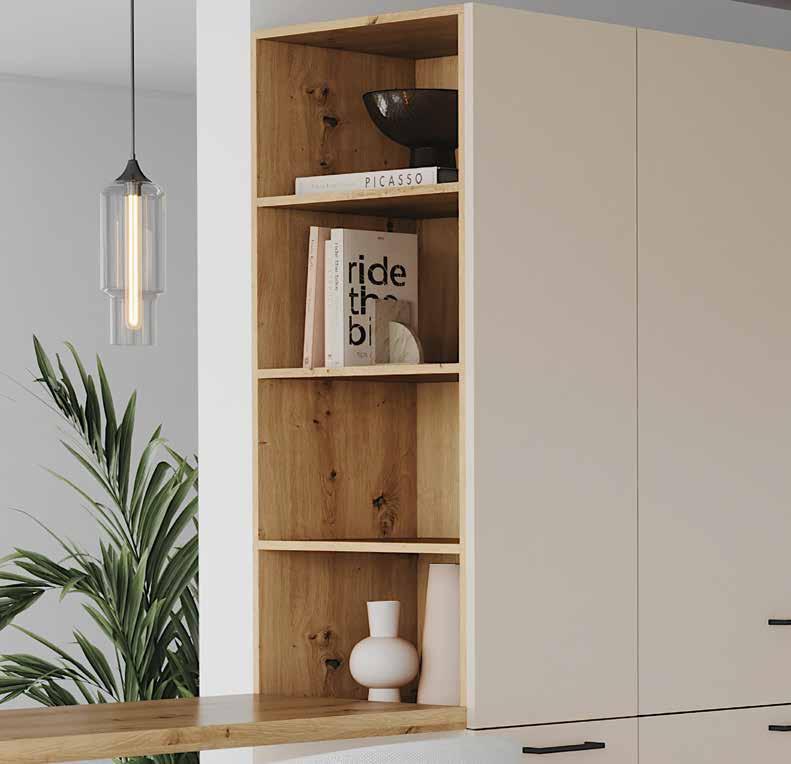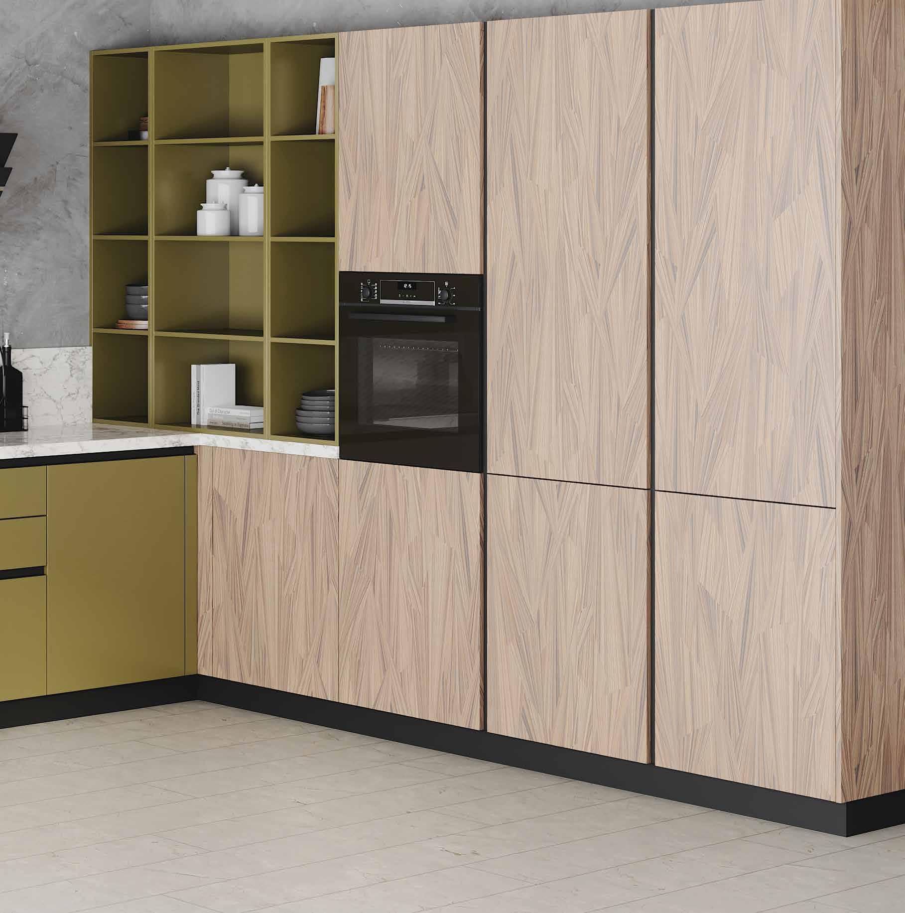 Keine Küche, wie jede andere. Das liegt nicht am spannenden Material-Mix aus samtmatten Lackoberflächen in Olivgelb und Fronten in heller Holzoptik. Sondern auch am Zusammenspiel von Grifflosen Fronten und offenen StauraumElementen. Da wird das designstarke Regal im Industrial-Style zum optischen Sahnehäubchen.