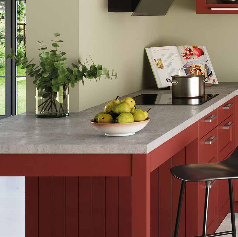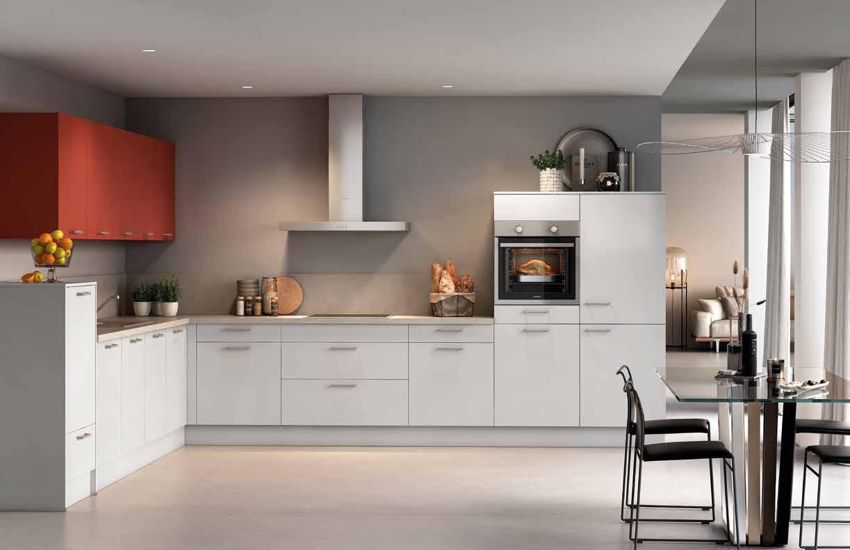 Wo das bunte Leben tobt, bringen wir gerne Farbe ins Spiel. Herbstrot zum Beispiel. Eine Küche, in der sich die moderne Familie wohlfühlt, hat dazu noch mehr zu bieten: Wohnliche Vitrinen-Oberschränke und eine perfekt abgestimmte Arbeitsplatte in Steindekor, die den großzügigen Ansatztisch optisch mit der Küche verbindet.