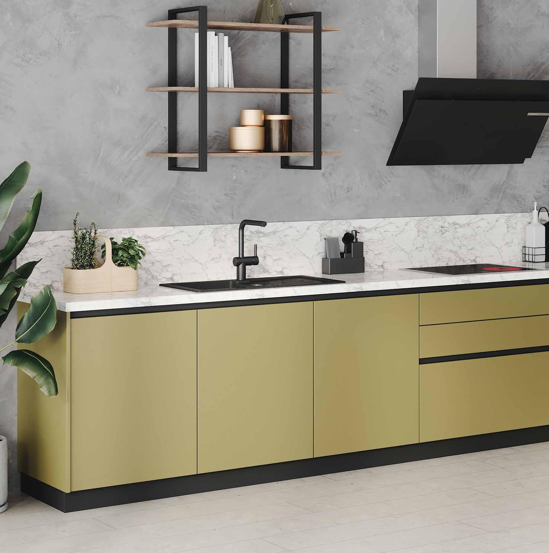 Außergewöhnlich ist Ihr Geschmack? Die Würze des Küchenlebens: Satte Farben wie Olivgelb. 11.198,Küchenkombination KA 54.160 und 53.210 inkl. Elektrogeräte ohne Dekoration Lieferpreis 237001-508-A4P