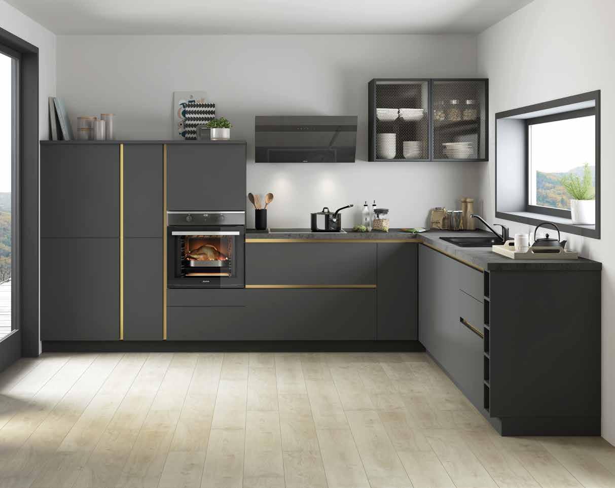 Küchenkombination KA 50.100 in Lavaschwarz, ca. 346 x 285 cm. Ausgestattet mit Juno Elektrogeräten: Backofen JB084C1 (EEK* A, in einer Skala von A+++ bis D), Kühlschrank JCN122F0S1 (EEK* F, in einer Skala von A bis G), GlaskeramikKochfeld JKSN606F5 und mit Airforce Wandesse F177V490BK (EEK* A, in einer Skala A+++ bis D).