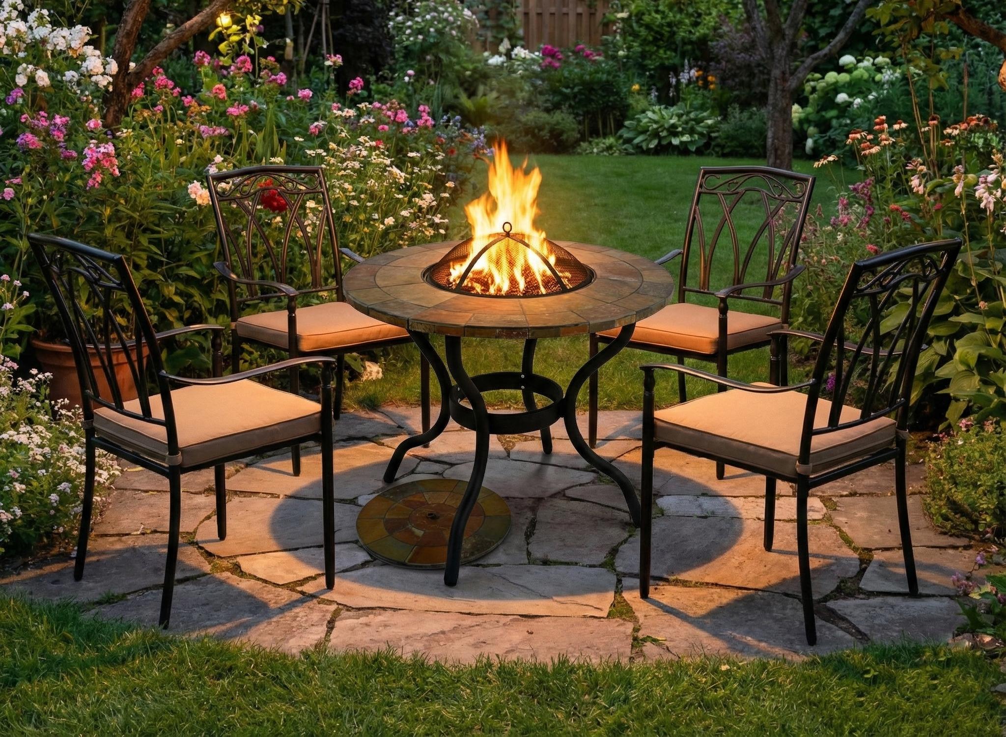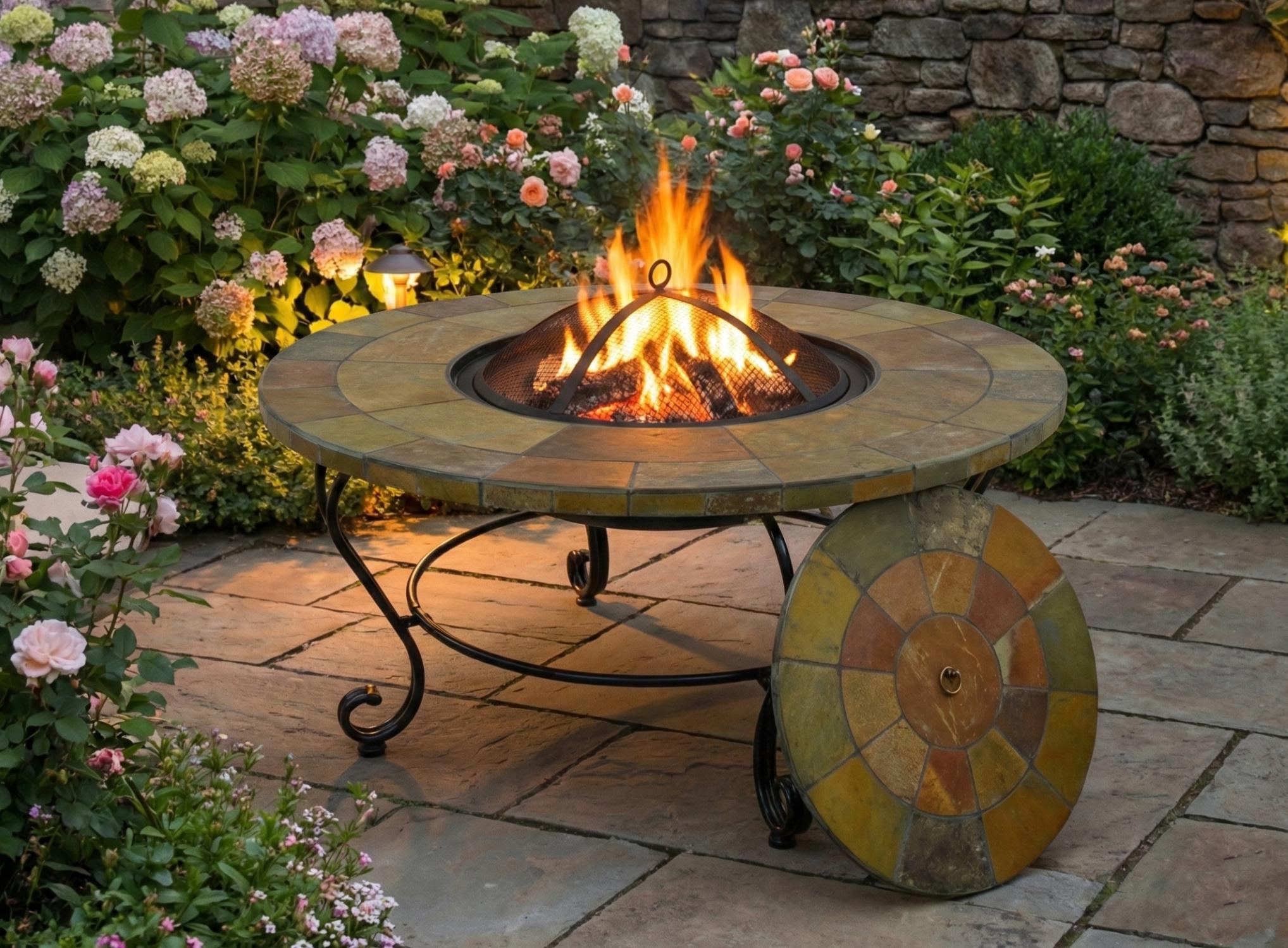 This versatile firepit table is designed with a stone top and can function as a firepit for warmth or a regular table whenthecentreinsertisinplace.The natural stone and slate tabletop has a slightly riven finish.