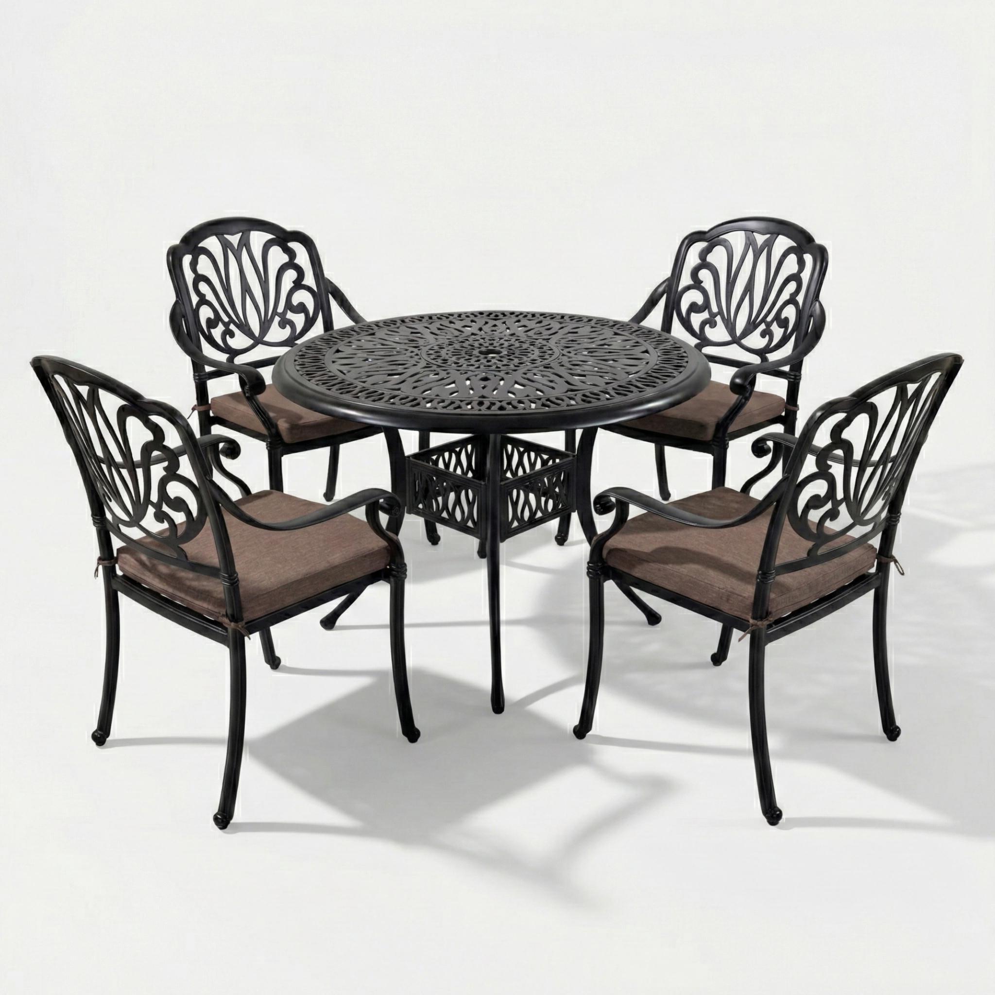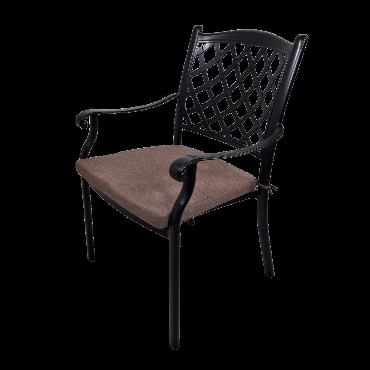 TheCastinoChairfeaturessleekblack ornamental aluminium frames with soft mocha coloured cushions, offering stylish, modern seating. Lightweight and stackable for convenient storage, these durable, weather-resistant chairs provide comfort and practicality. Perfect for indoor or outdoor use, the Castino chairbringseffortlesselegancetoany