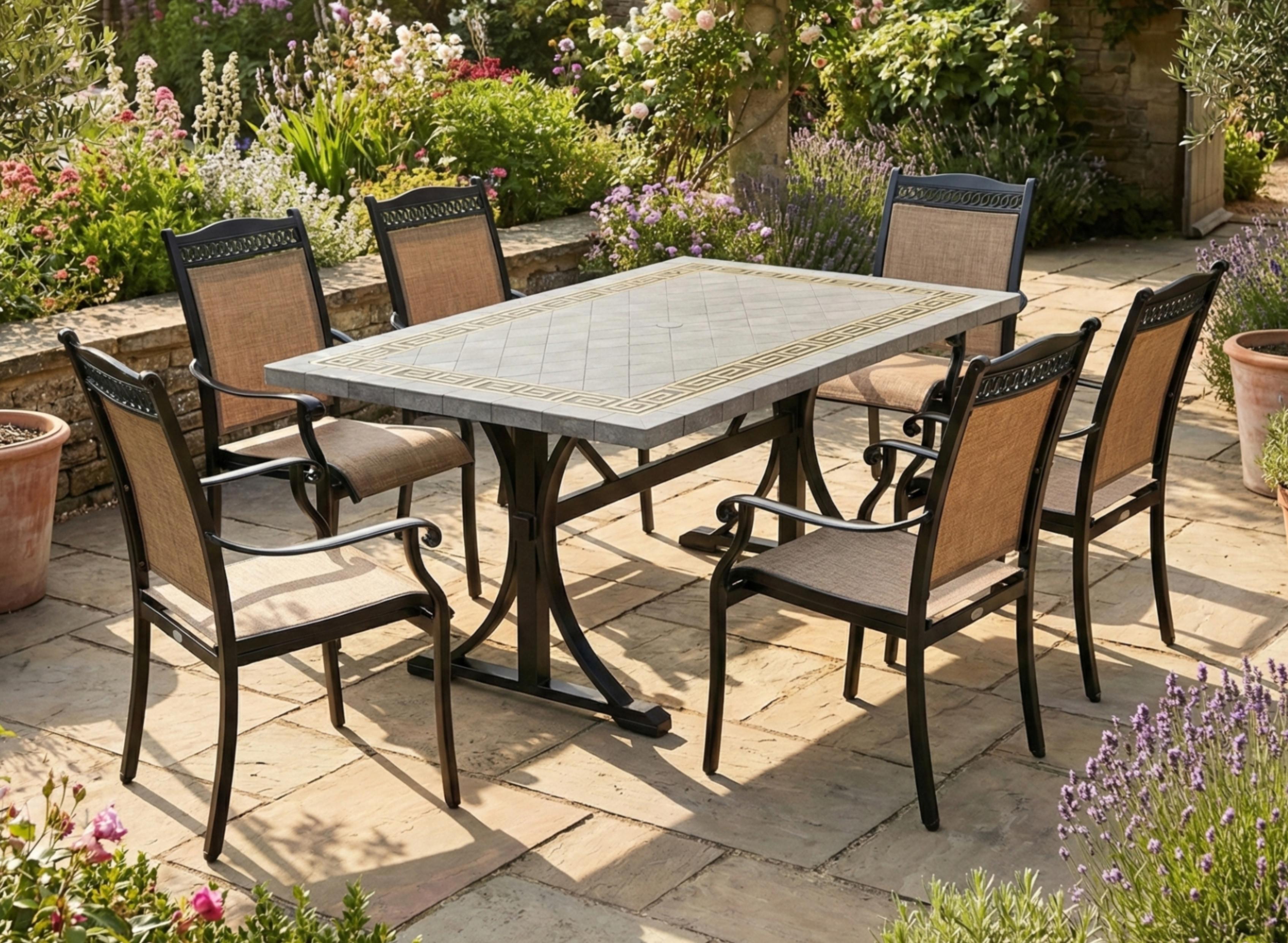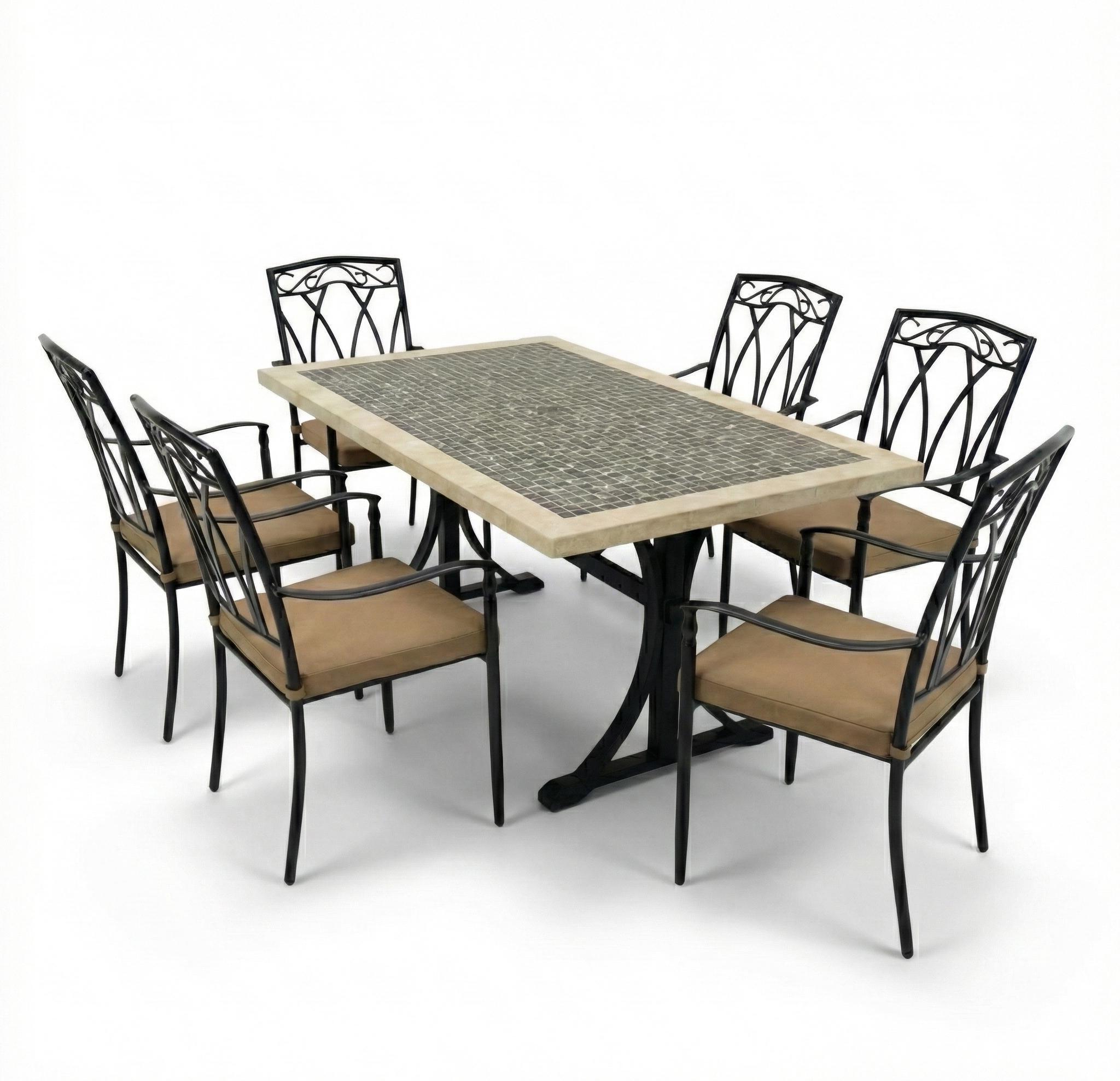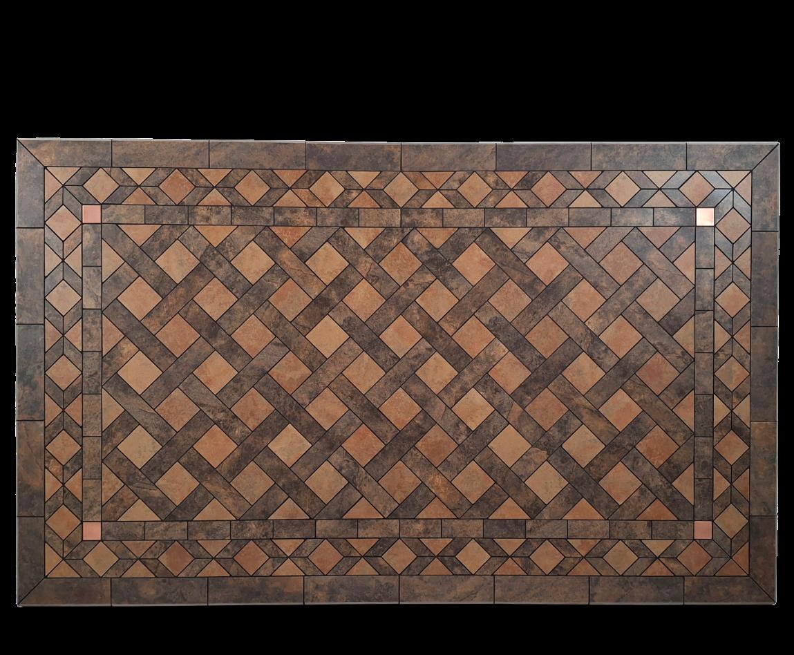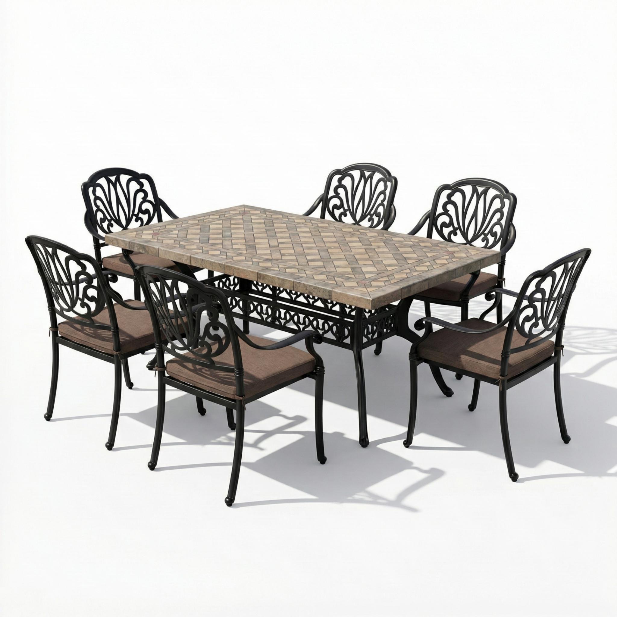 TheRosellorectangulartablefeatures a striking geometric mosaic of ceramic tiles, arranged in a diagonal lattice pattern of variegated browns and greys. This intricate top rests on elegant, rust-resistant aluminium legs, finished in a classic black powder coat for lasting durability.