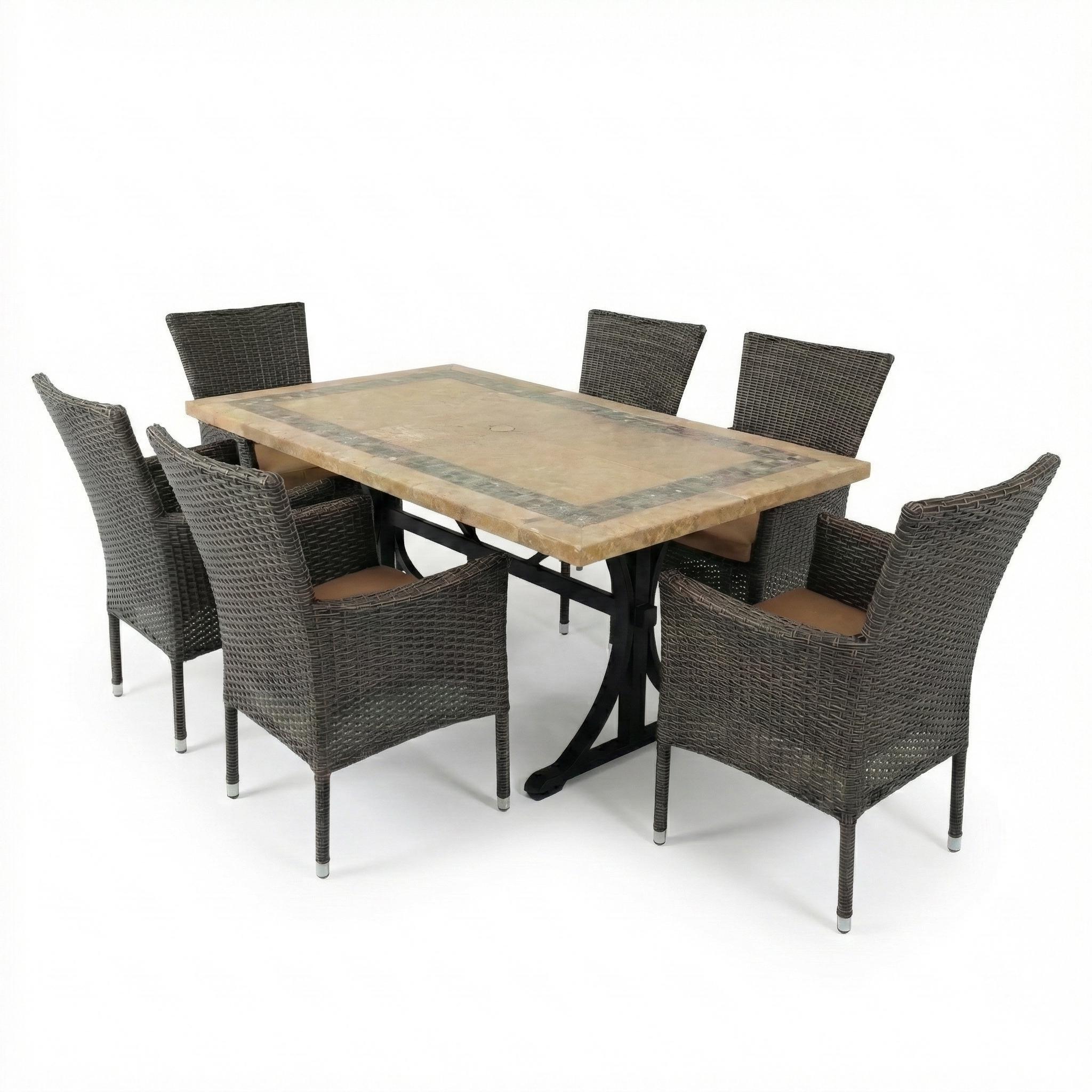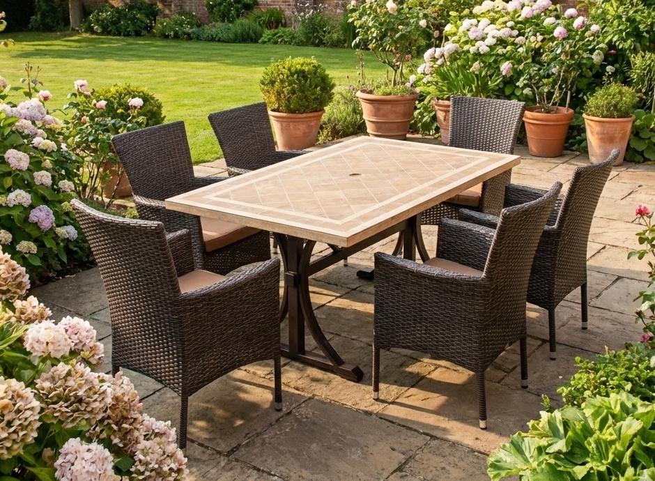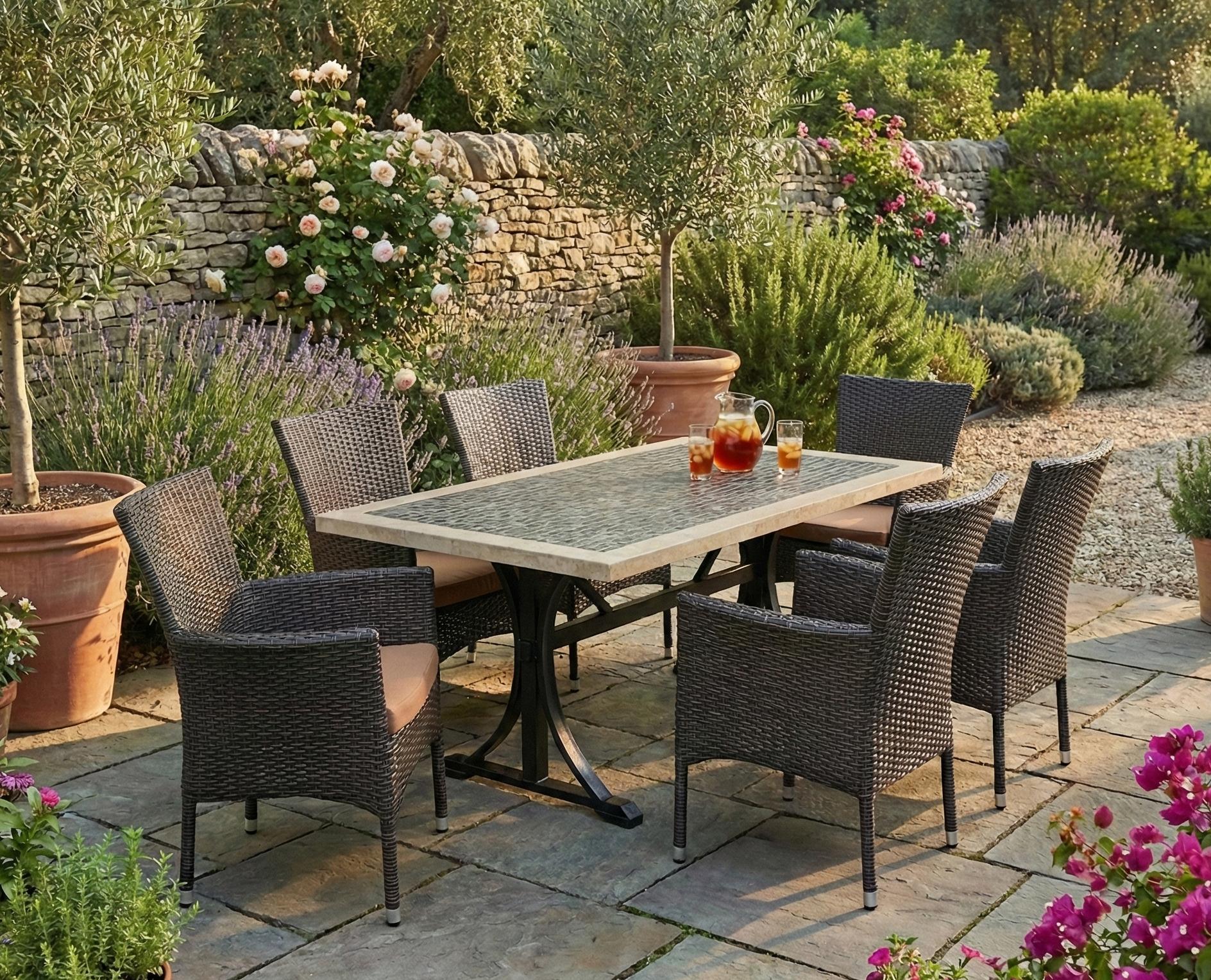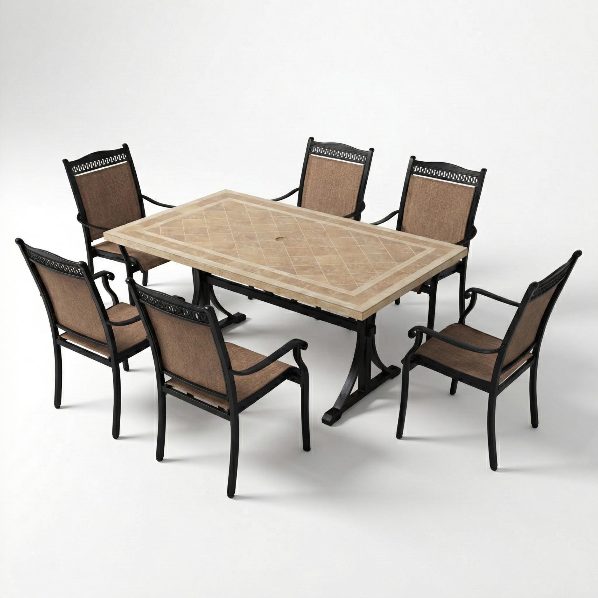 TheRosellorectangulartablefeatures a striking geometric mosaic of ceramic tiles, arranged in a diagonal lattice pattern of variegated browns and greys. This intricate top rests on elegant, rust-resistant aluminium legs, finished in a classic black powder coat for lasting durability.