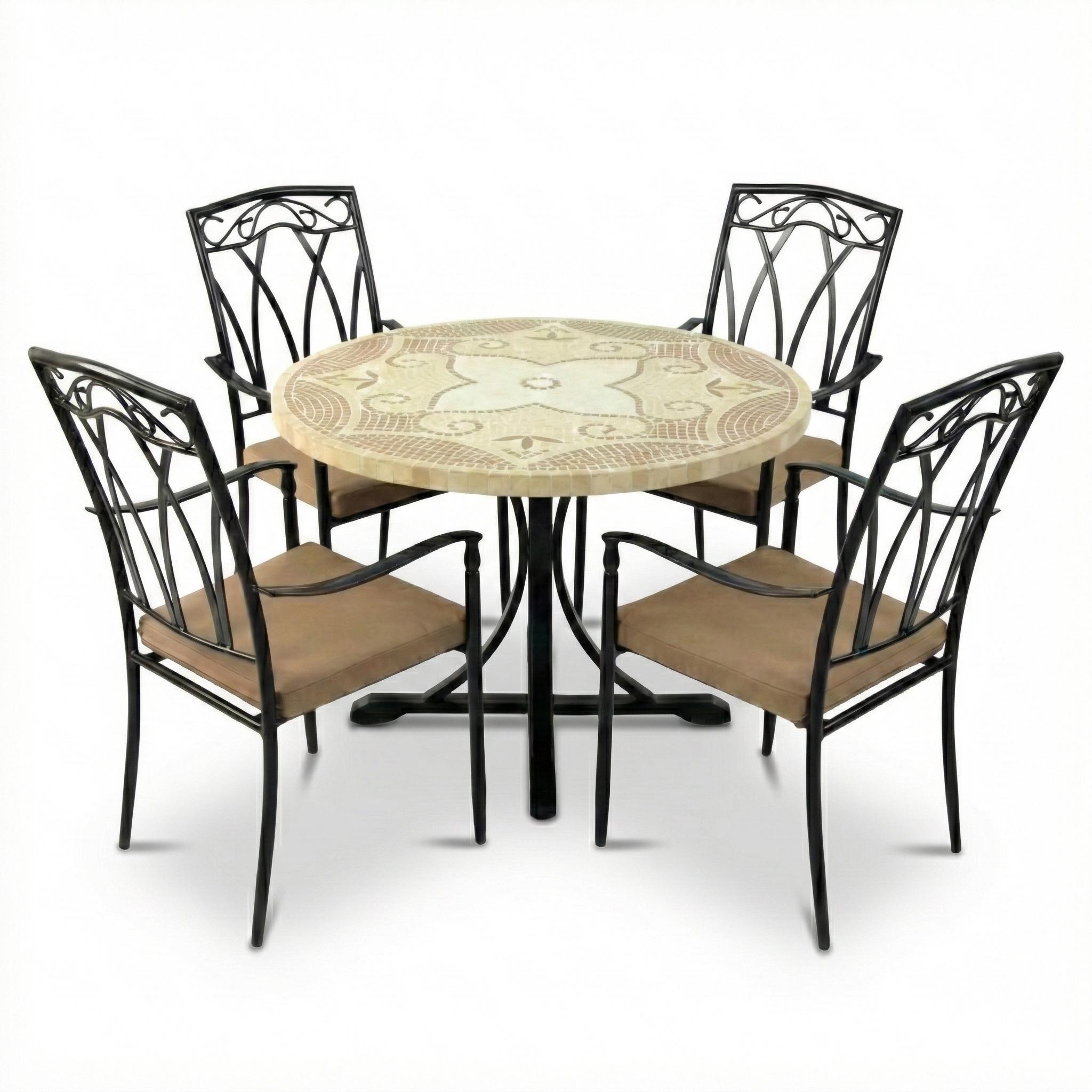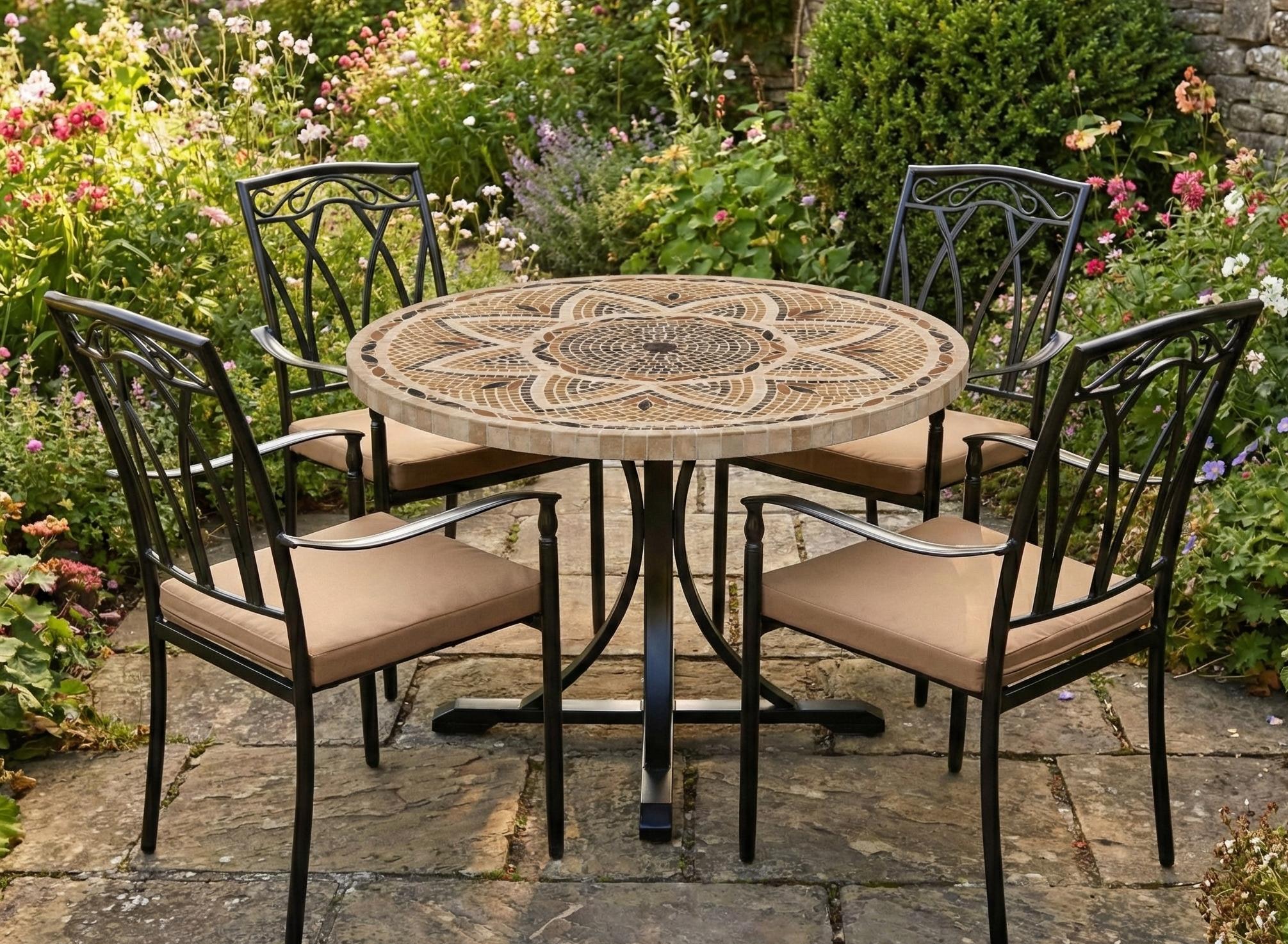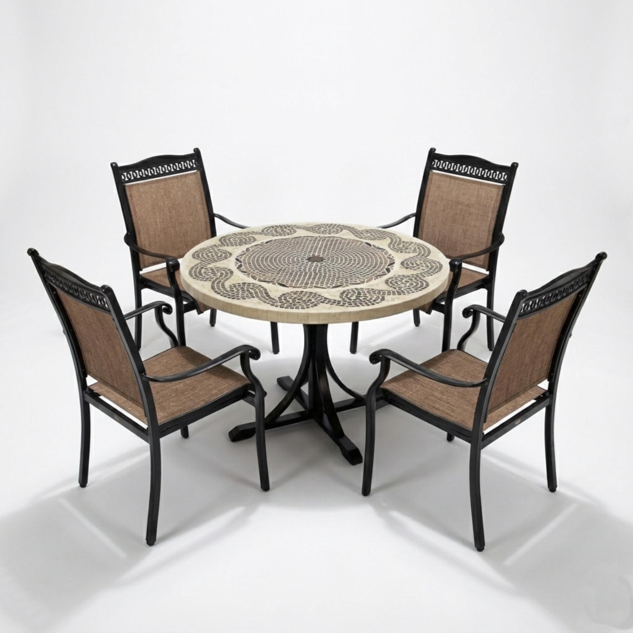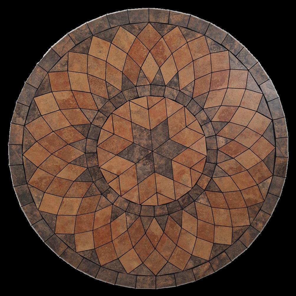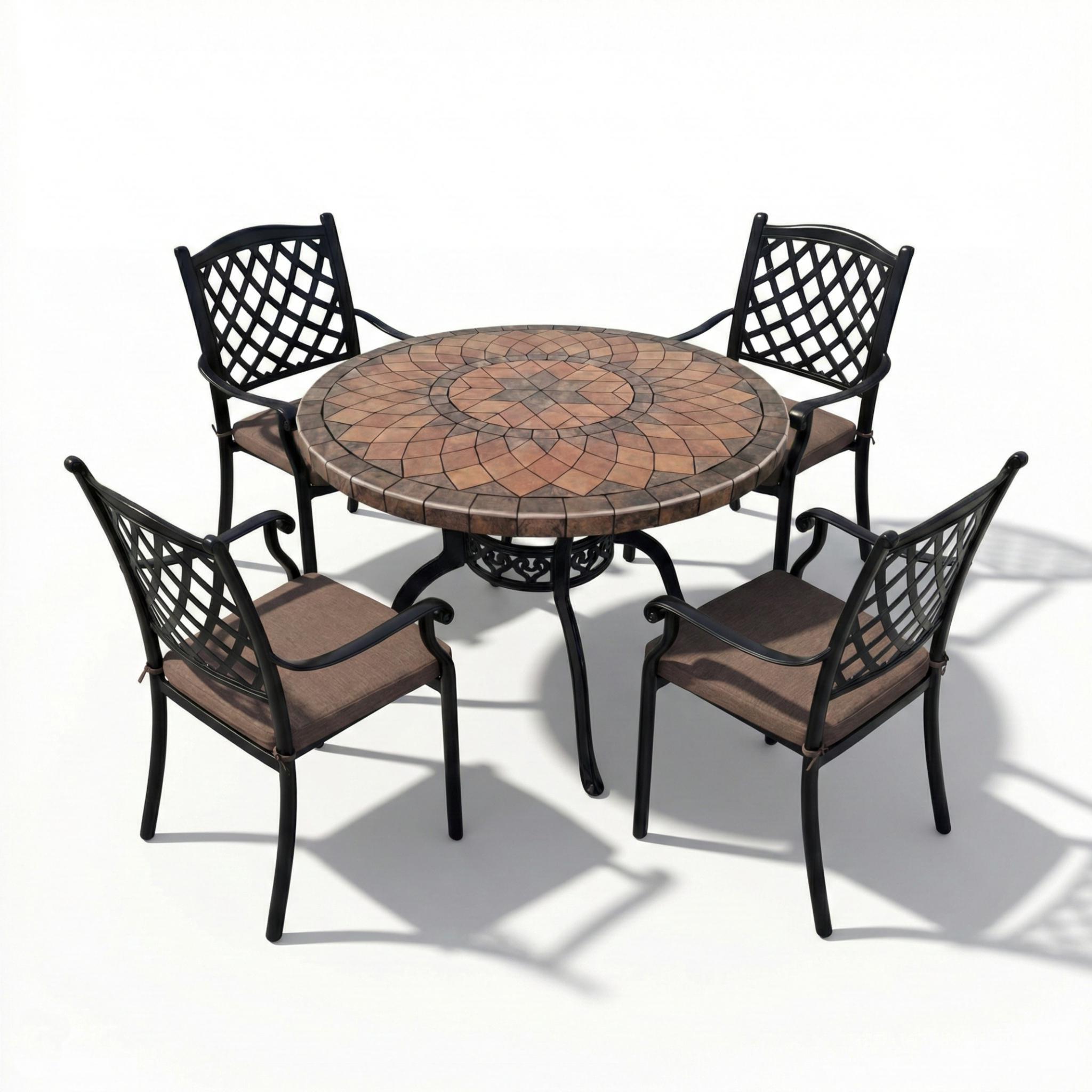 This round table is defined by its craftsmanship, featuring a distinct ceramic top with a central star mosaic. The warm brown and terracotta tiles are carefully handlaid, creating a unique, earthy aesthetic. The top rests on strong, rust-resistant aluminium legs finished in a durable black powder coat, detailed with an elegant central connecting ring.