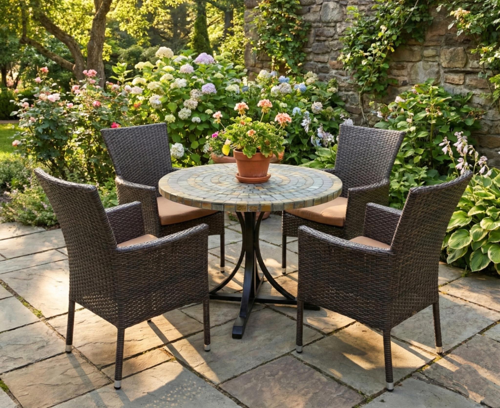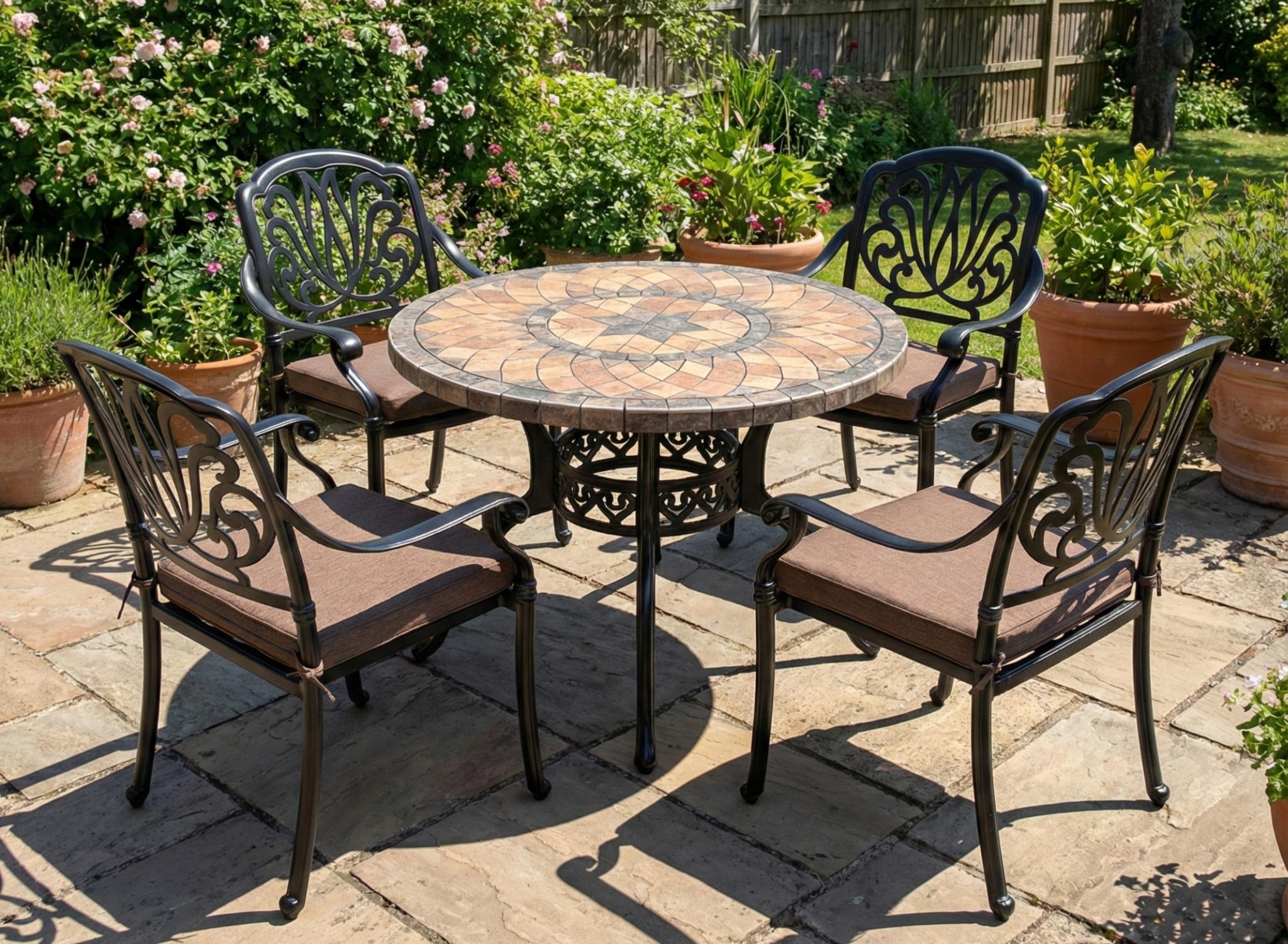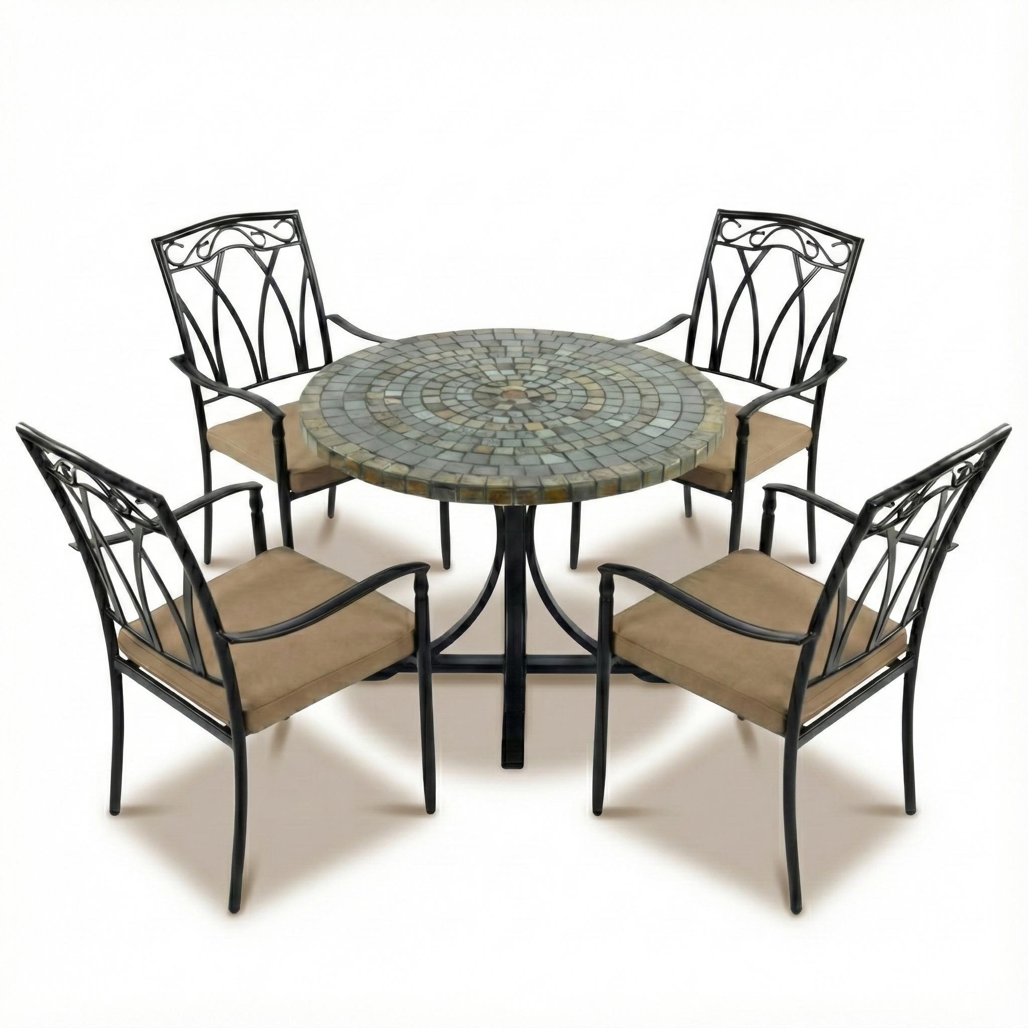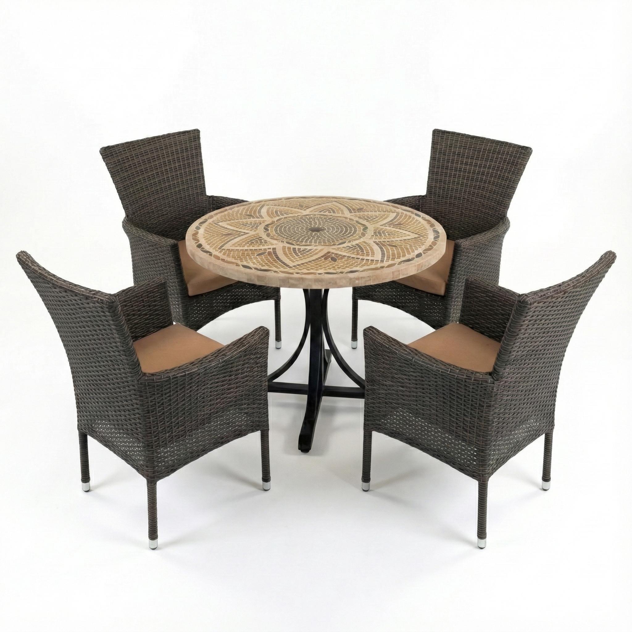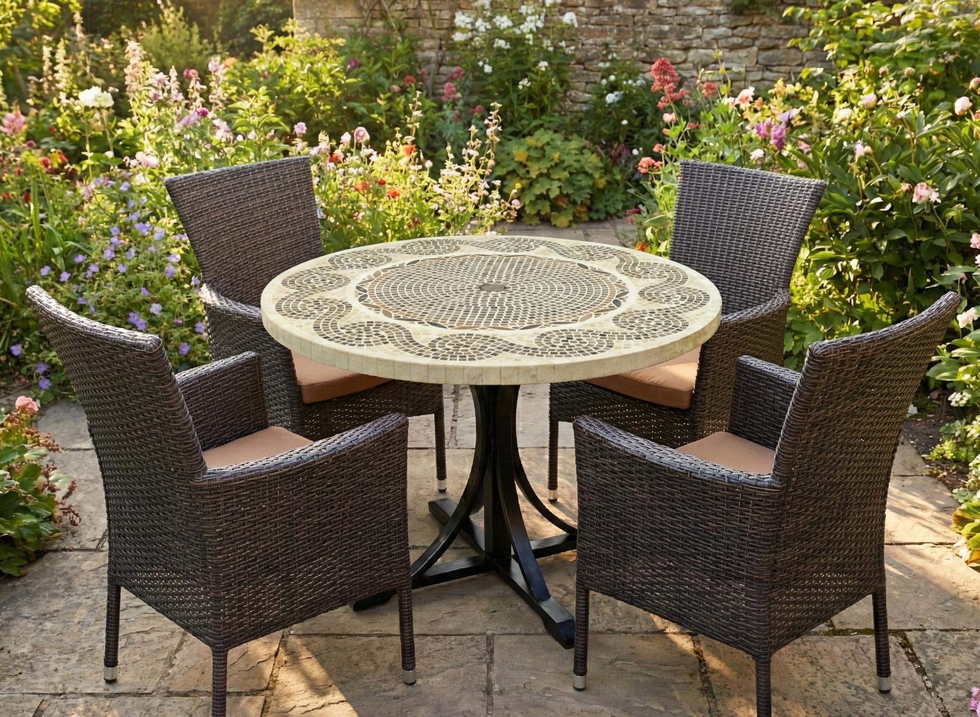 This round table is defined by its craftsmanship, featuring a distinct ceramic top with a central star mosaic. The warm brown and terracotta tiles are carefully handlaid, creating a unique, earthy aesthetic. The top rests on strong, rust-resistant aluminium legs finished in a durable black powder coat, detailed with an elegant central connecting ring.