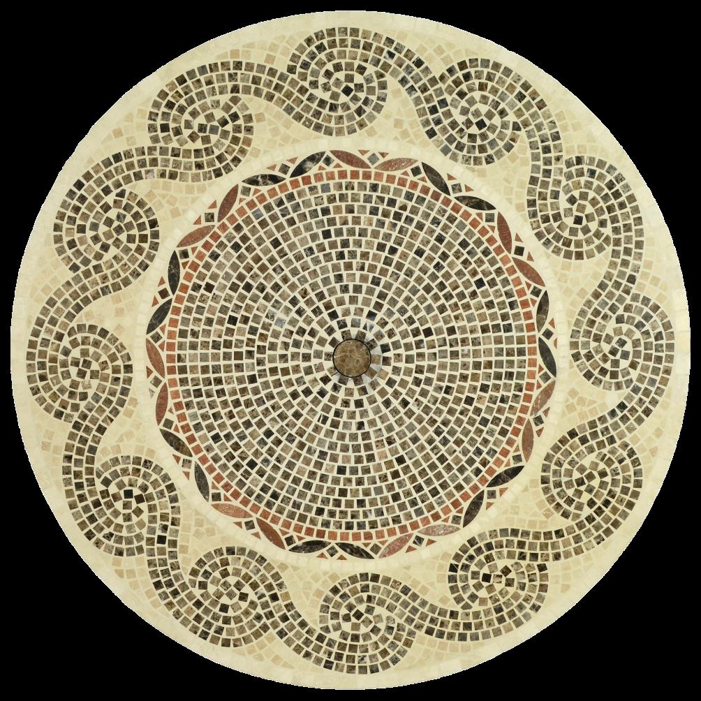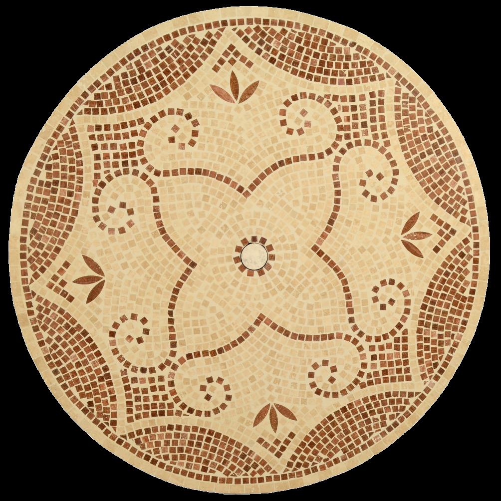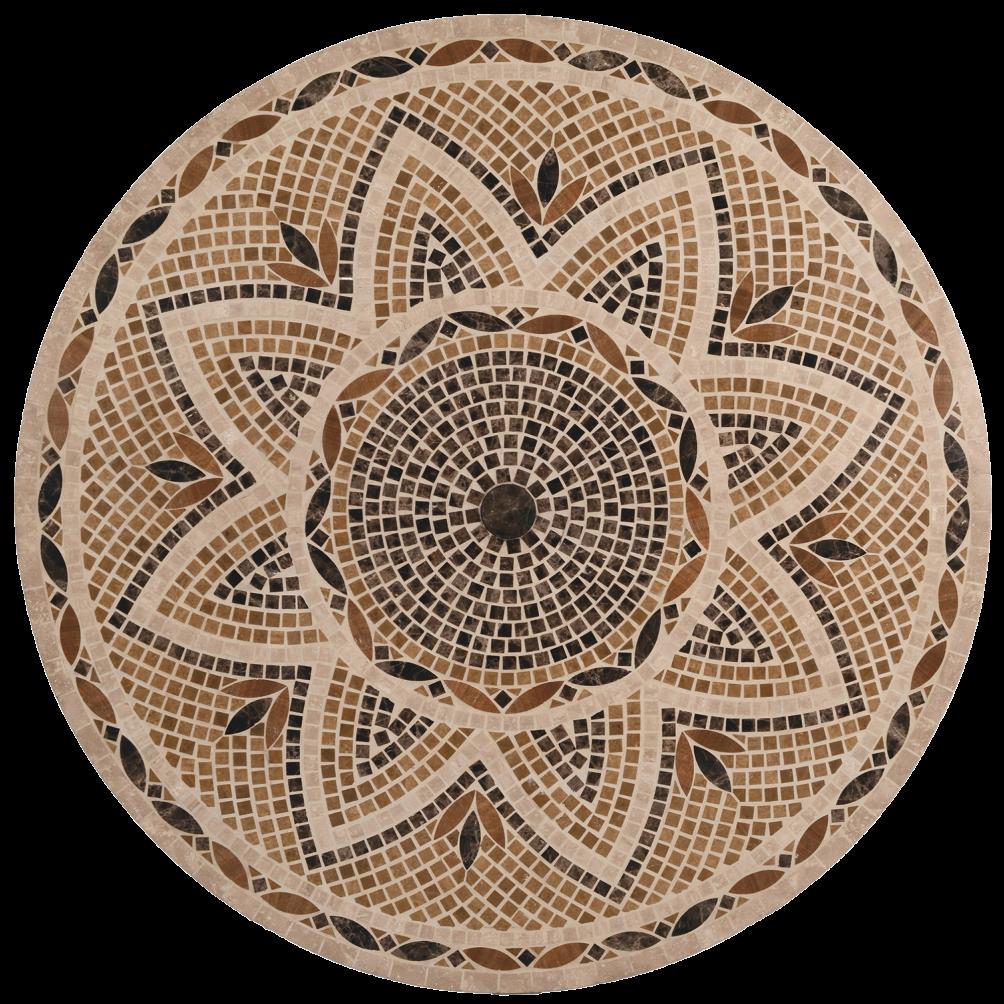 This round table showcases an intricate mosaic design of hand-cut andhand-positionedmarbletiles.The colour palette includes a warm cream background with feature tiles in pale browns, terracotta and rich dark browns. Like others in the range, it is supported by a sturdy steel pedestal frame.