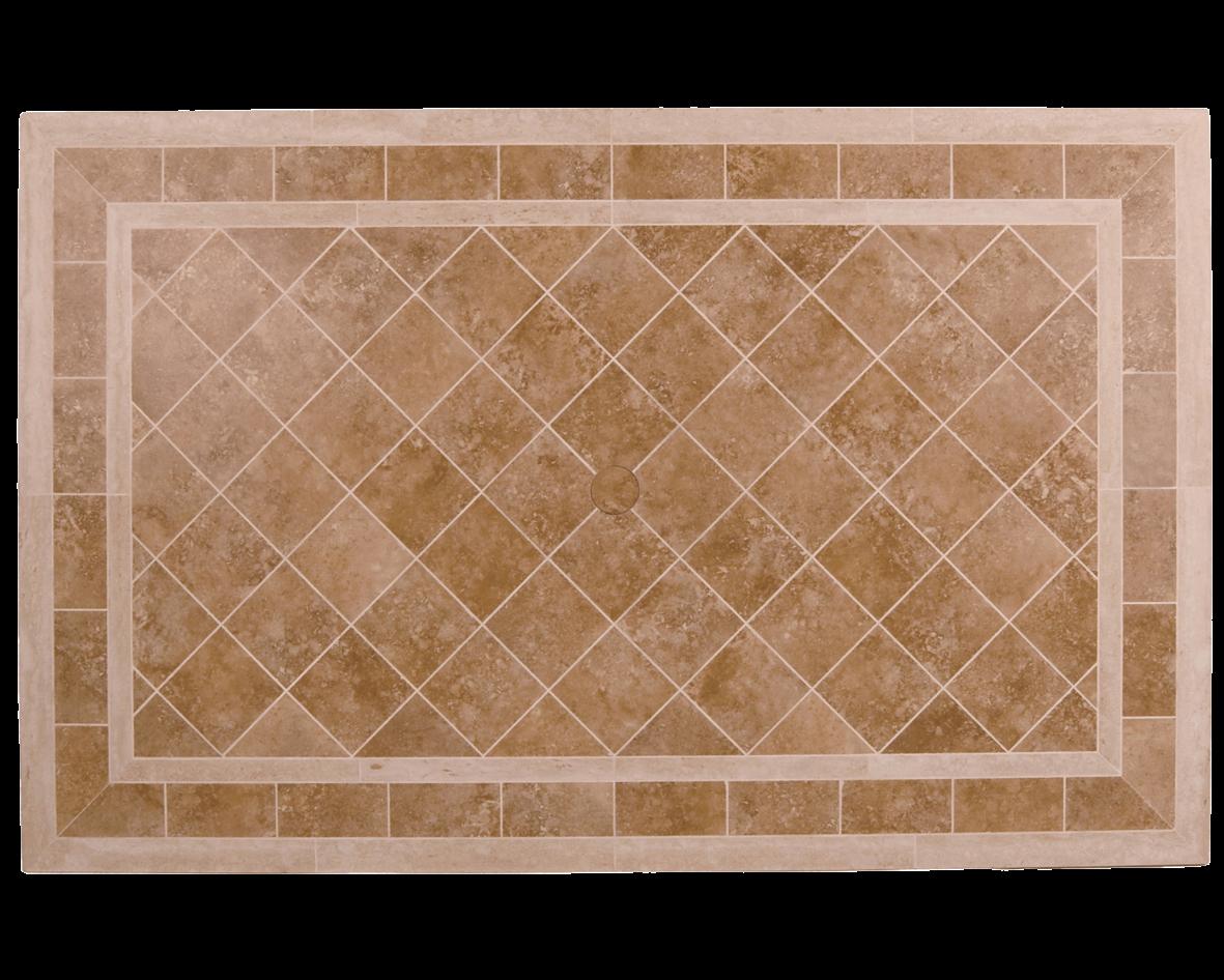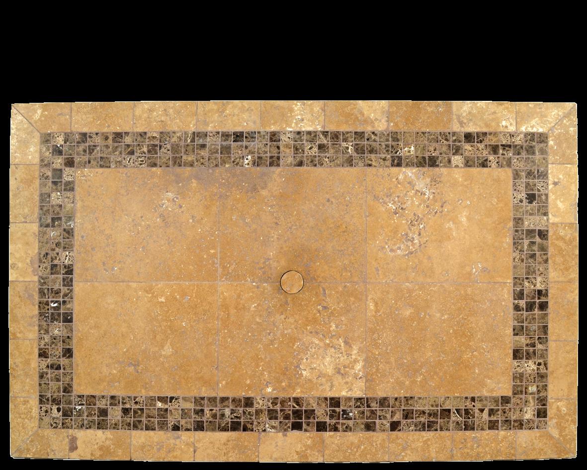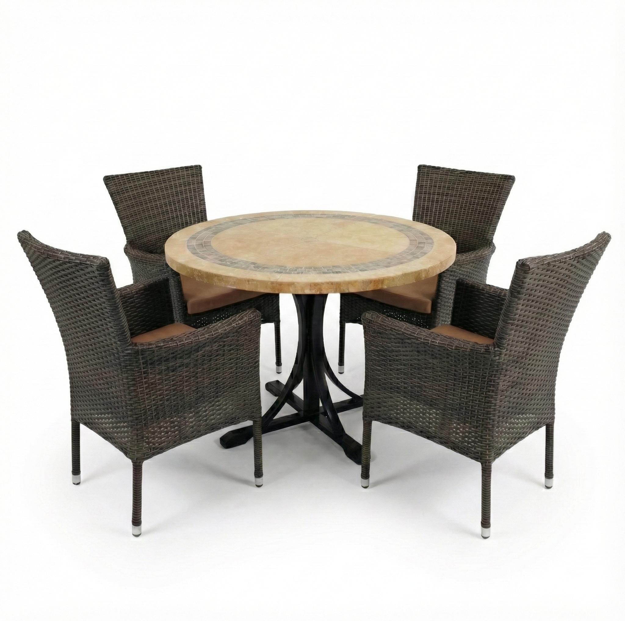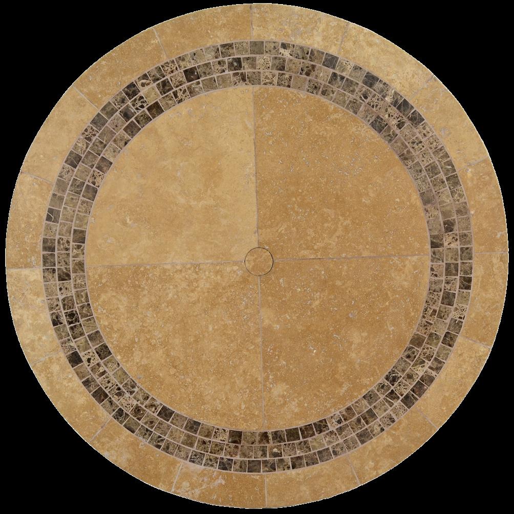 A timeless circular table that matches theCharlestoninstyle,constructedof warm terracotta-coloured Noce Travertine. It features a contrasting band of Dark Emperador Marble and a travertine edge. The hand-laid marbletilesaresmooth,andthetable serves as an ample four-seat dining option.