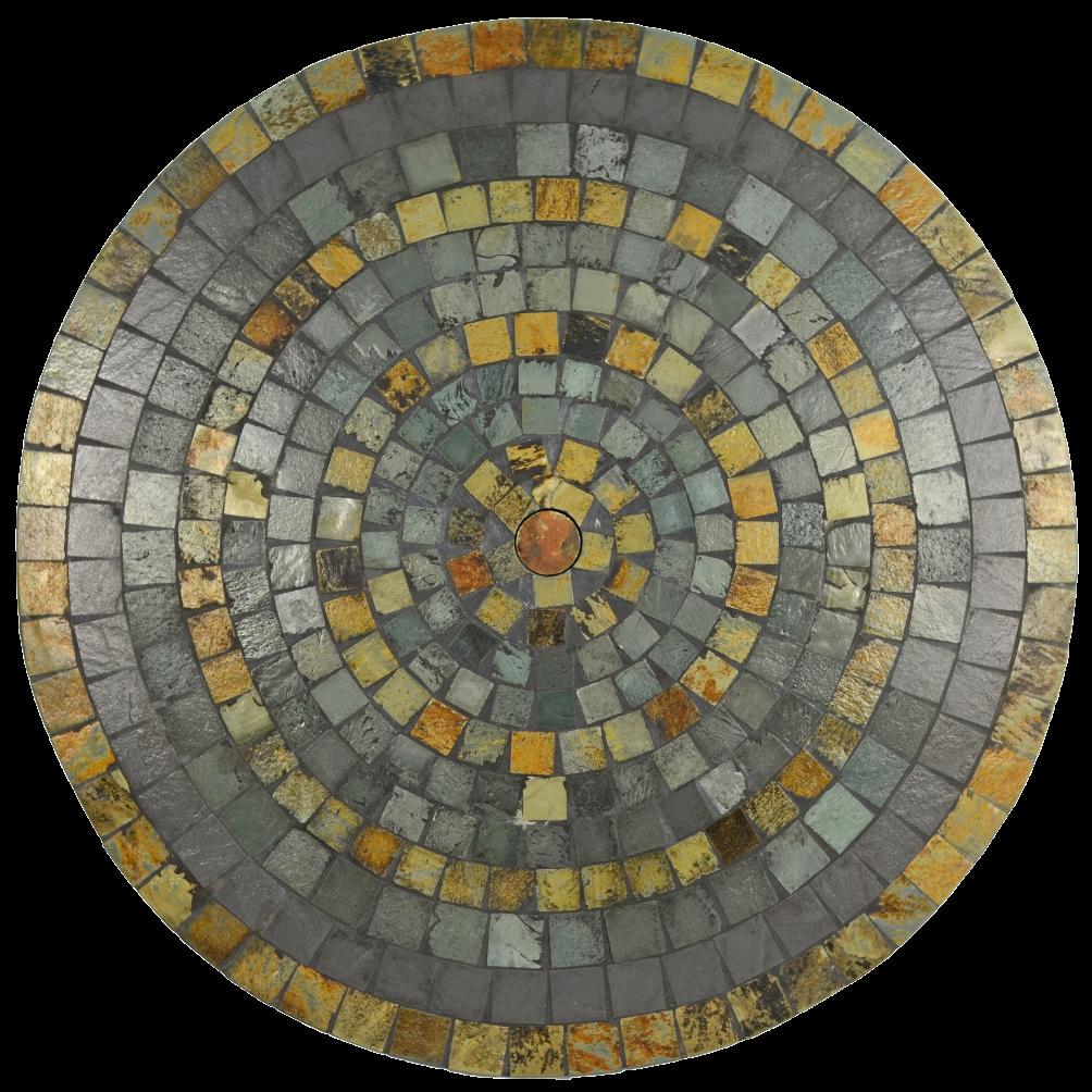 A rustic-style 100cm round table featuring a riven surface top made of naturalstoneandslate,hand-laidina mosaic style. It boasts warm, natural, earthy tones and a stone edge. The topissupportedbyasturdypedestalstyle steel leg assembly, powdercoated in black.