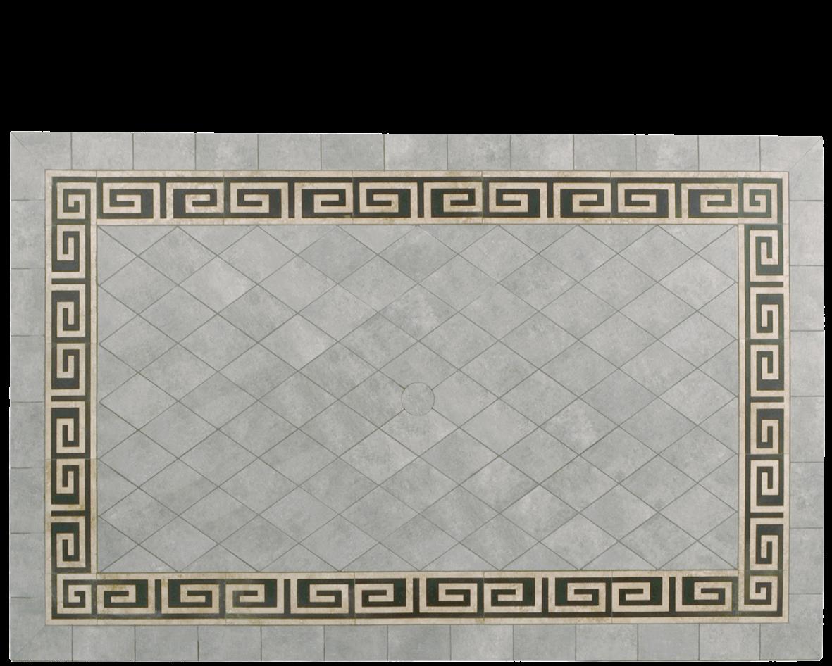 A dramatic rectangular dining table that features a slightly textured ceramic tile top, predominantly grey in colour. It is distinguished by a GreekKeydesignfeaturebandingold andblack,offeringaclassicaesthetic. The table is supported by sturdy steel legs, powder-coated in black, and includes adjustable feet for uneven surfaces.