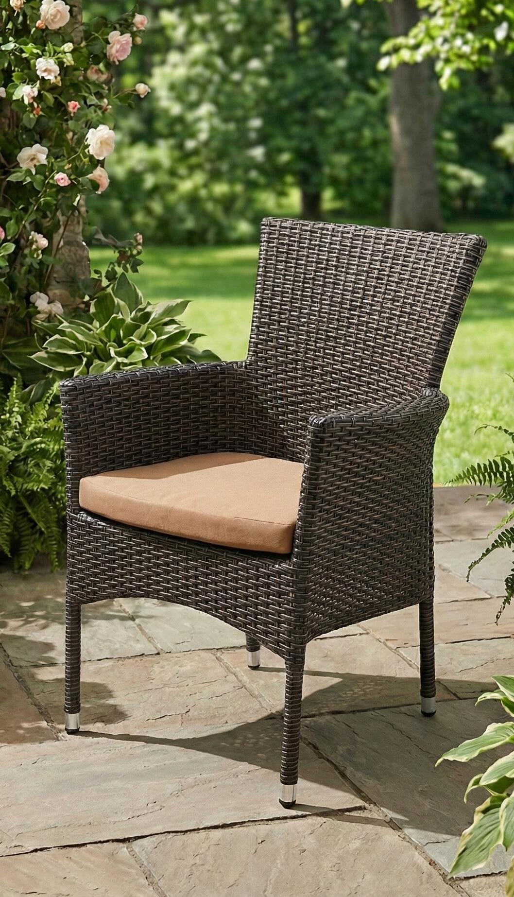 The Stockholm Chair features a textured synthetic resin weave on an aluminium frame, making it lightweight and easy to move. The beige cushion adds comfort, and the chair is stackable, rust-resistant, and ideal for indoor or outdoor use. No assembly required.