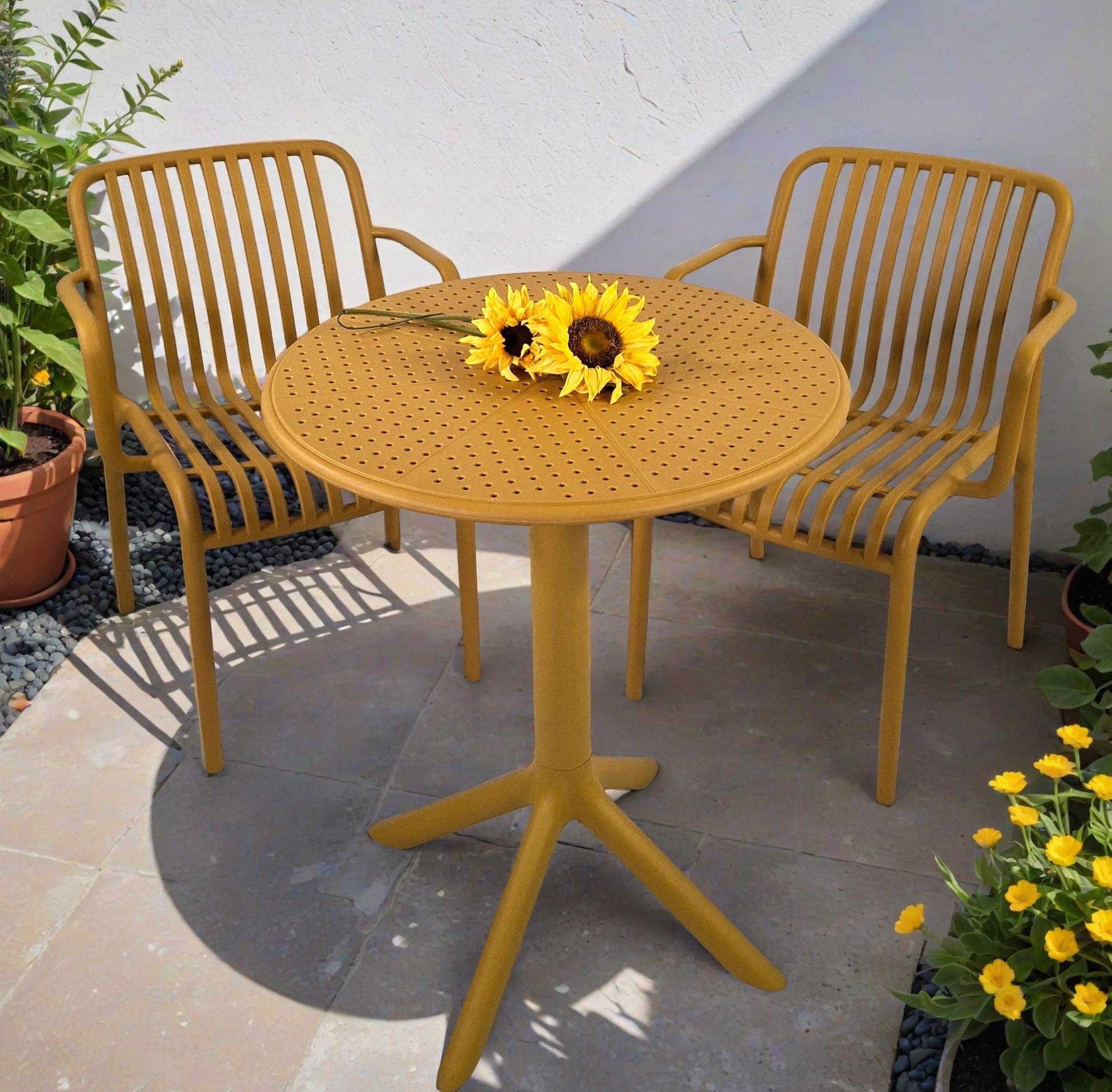 The Bergen table adds a vibrant touch to any space, indoors or out. Its classic pedestal design offers easy, no-tool assembly and seats two comfortably. Made from durable polypropylene, it's low-maintenance and effortlessly portable for versatile use around the home.