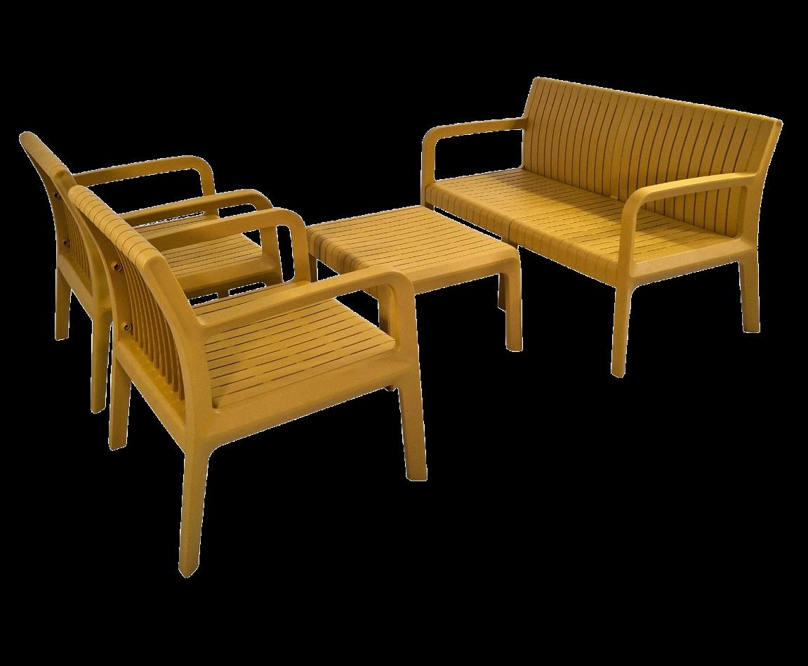 The vibrant Freya lounge set features two armchairs, a two-seat sofa, and a stylish side table, all crafted from durable polypropylene with UV inhibitors. Coloured in soothing avocado green, this versatile set enhances both indoor and outdoor spaces with elegance and comfort.