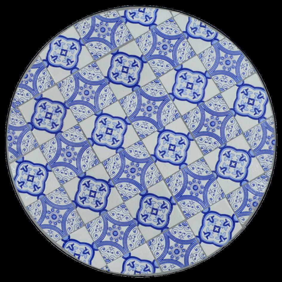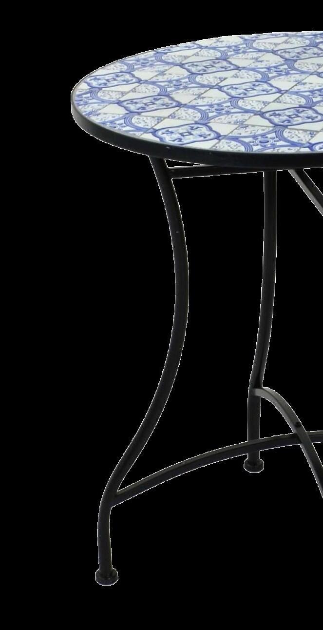 This charming bistro table features a durable ceramic hand cut tiled top with a captivating blue and white pattern reminiscent of traditional Portuguese Azulejo tiles. The striking cobalt and light blue patterns contrast crisply against the white background. This artistic top rests on a sleek black metal frame with gracefully curved legs, offering a stylish and resilient accent for indoor or outdoor European-inspired decor.