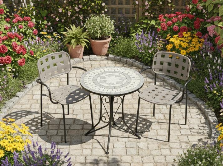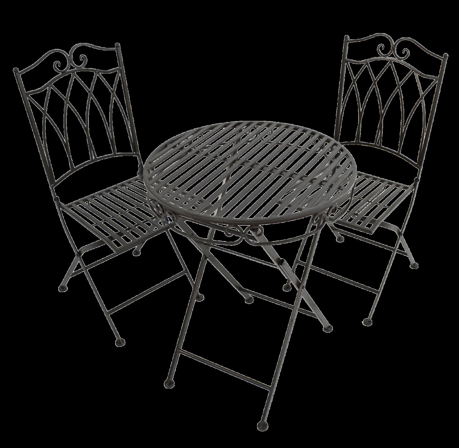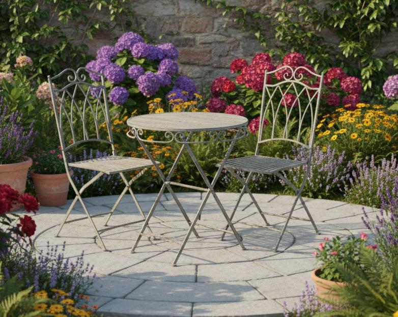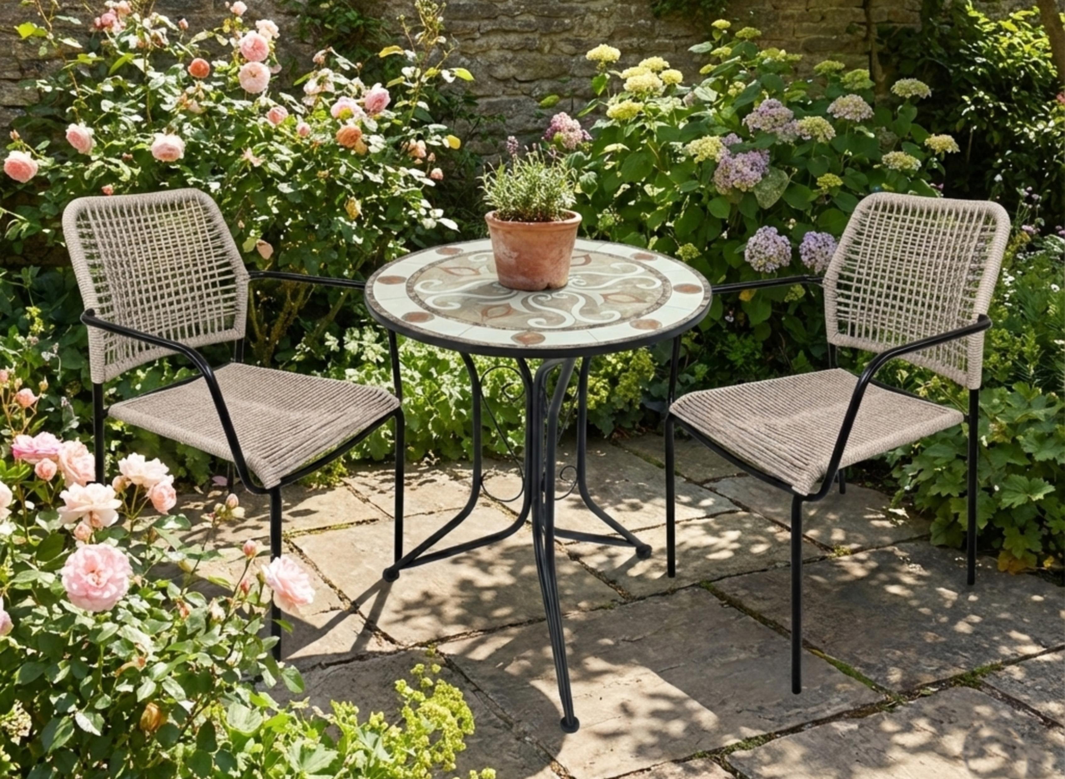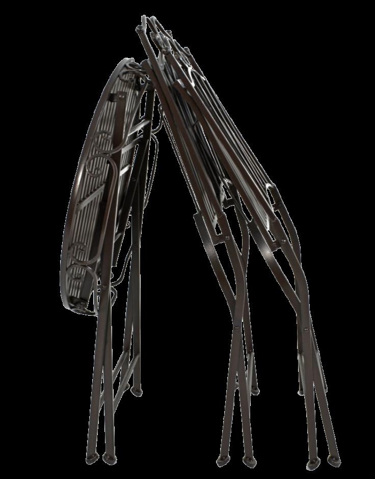 The Rochelle Bistro Set features elegant folding chairs and table with decorative scrolling, crafted from powder-coated steel with a distressed finish that enhances over time, creating a vintage look. Perfect for outdoor use, it requires no assembly—just unfold and enjoy wherever you desire. Available in 2 colours, Mocha brown and light grey.