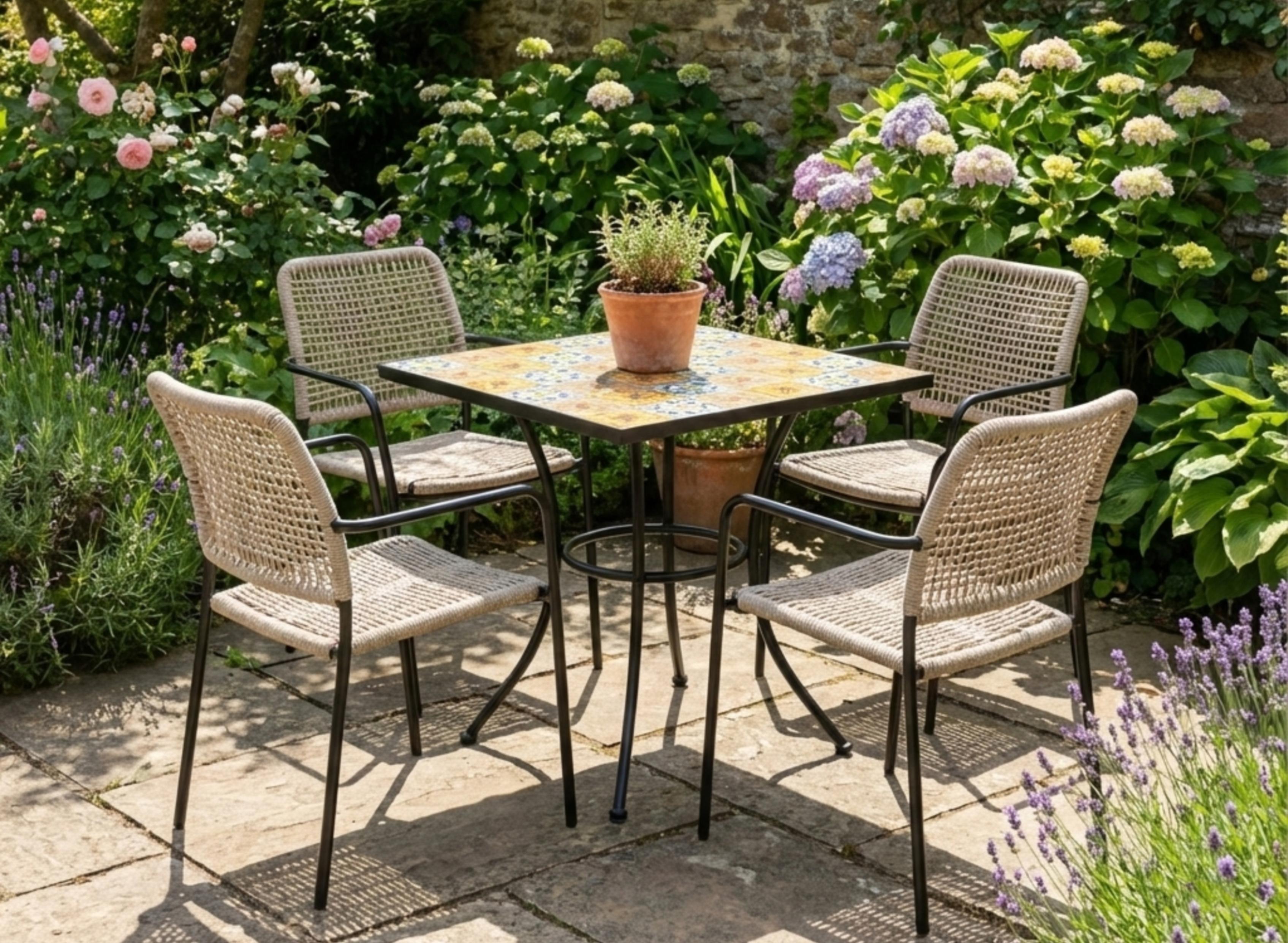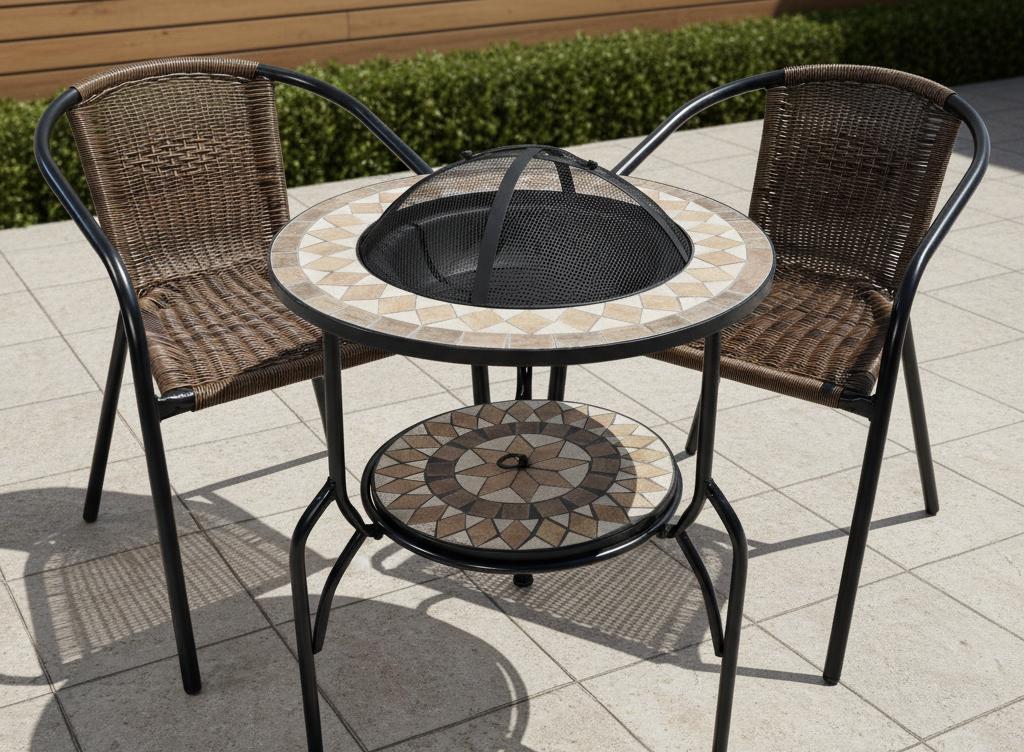 San Remo Chair set. The table features a handcrafted, circular firepit with a diamond mosaic top that converts into a table, complete with a grill for fuel. Paired with the San Remo Chair, which has a sleek steel frame and smooth resin wicker, this set combines style and functionality with minimal assembly.