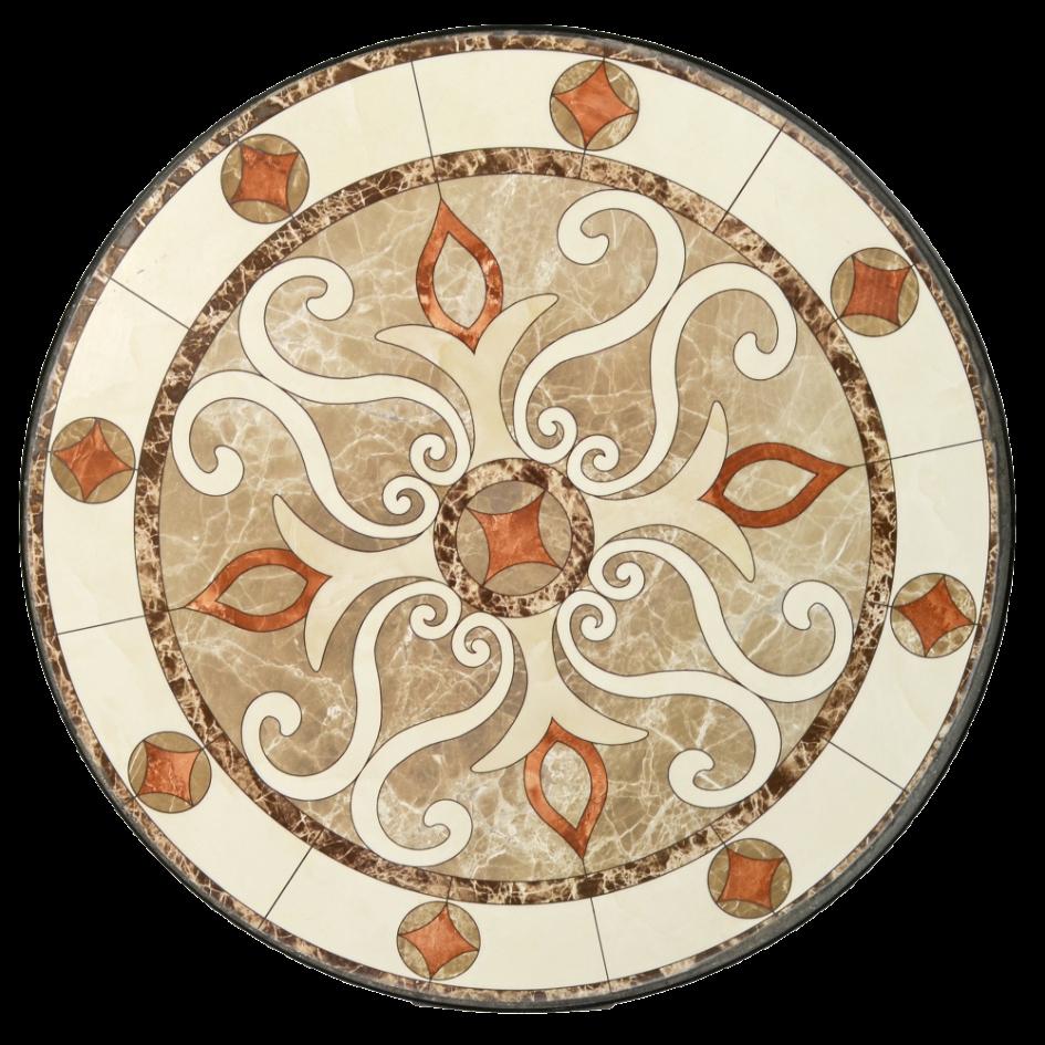 This sophisticated bistro table features a durable one peice tiled top with a luxurious, intricate medallion design. The design showcases flowing Baroque-style scrolls and leaf motifs, creating a look of classic elegance. It is supported by a graceful satin black steel base with delicate scrollwork, making it a beautiful and resilient addition to any refined patio or sunroom.