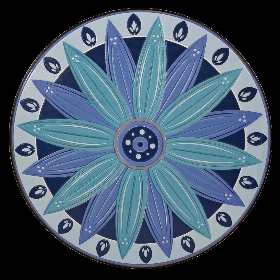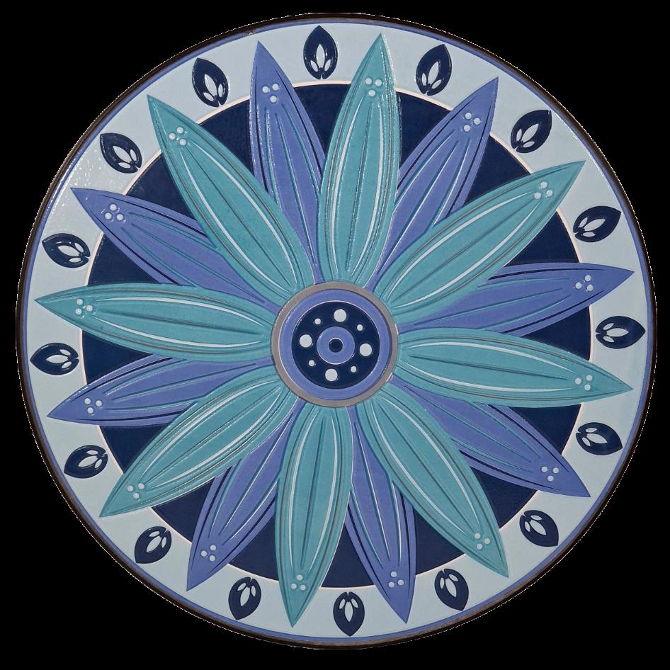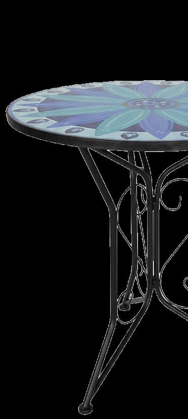 This eye-catching bistro table features a one peice durable ceramic tile top showcasing a beautiful, large floral medallion design. The color palette is a stunning array of vibrant blues and aquas, creating a cheerful, refreshing centerpiece. The table is supported by a satin black steel base with delicate scrollwork, making it a functional and artistic accent perfect for brightening up any patio, balcony, or garden area.