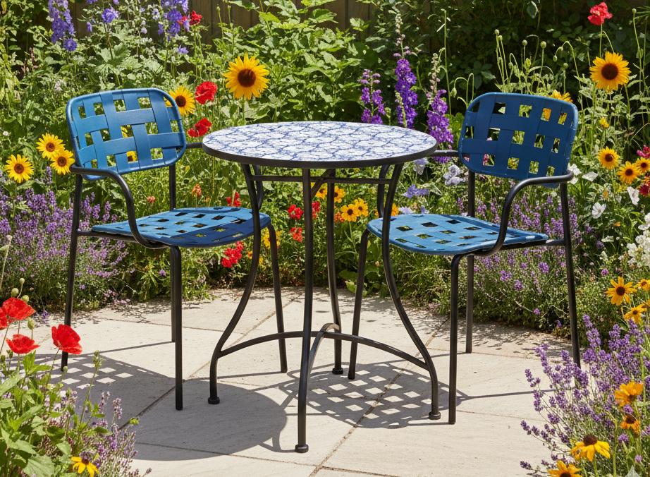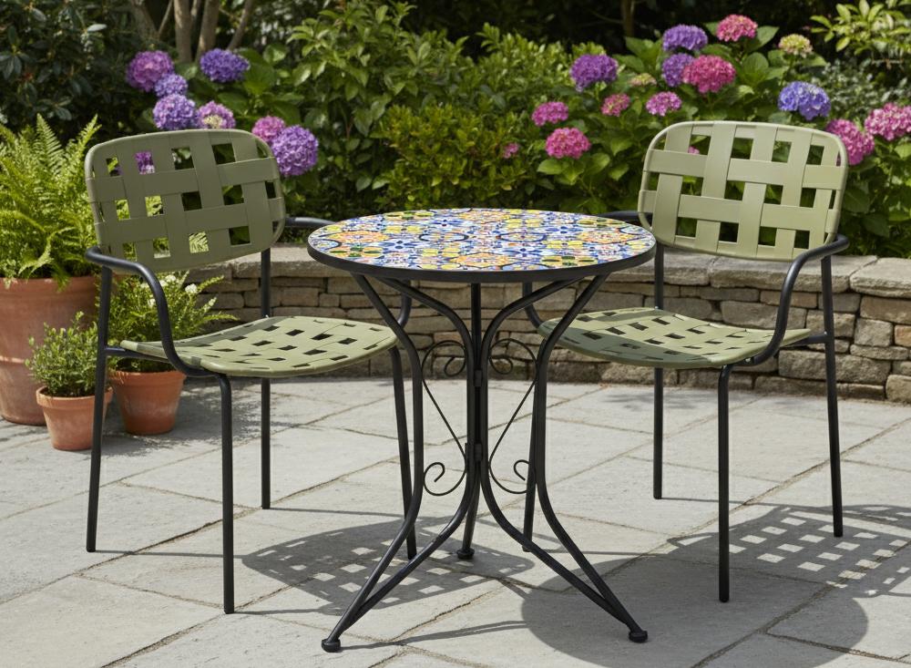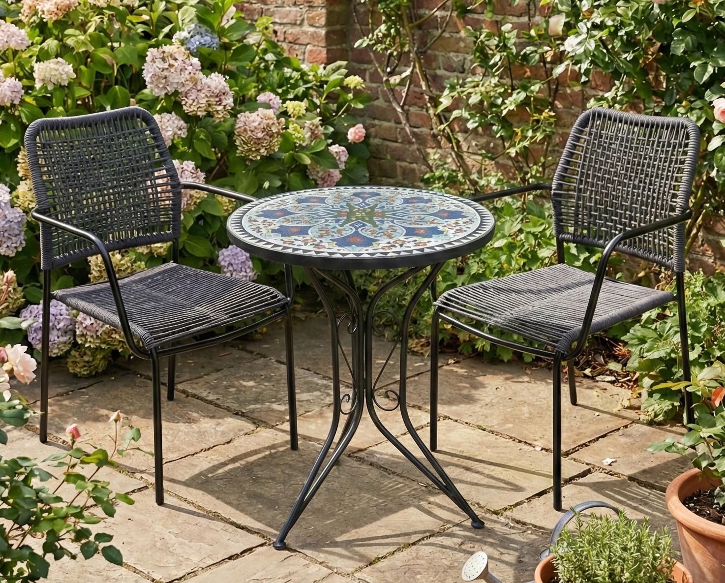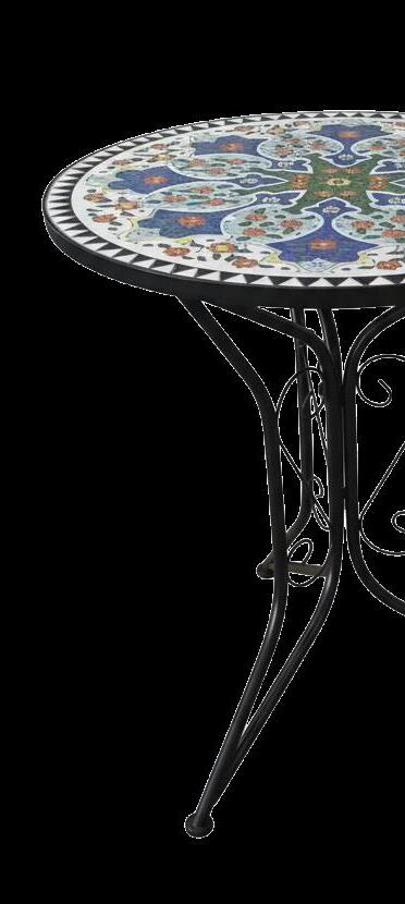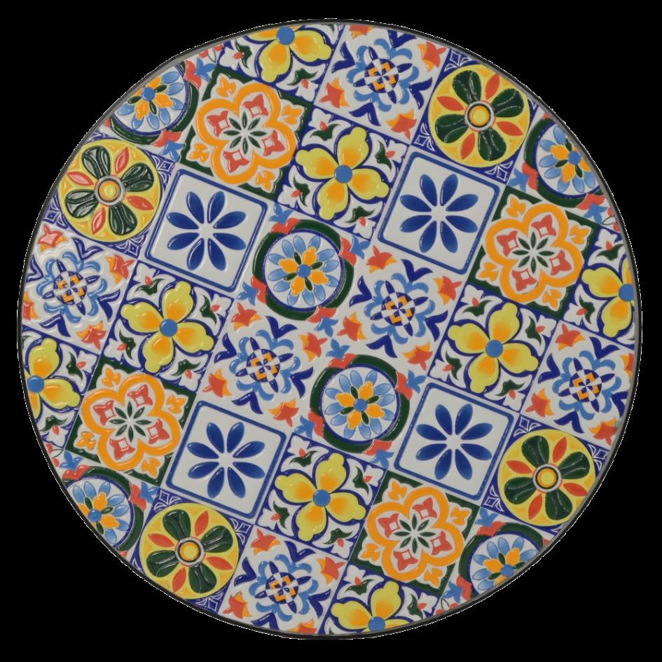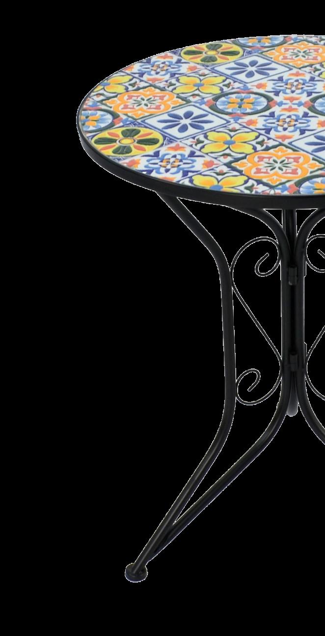 This cheerful bistro table features a durable on peice ceramic tiled top showcasing a lively Mediterraneaninspired design. The tiles burst with color, predominantly featuring bright cobalt blues, sunny yellows, and warm oranges in distinct floral and geometric patterns. This vibrant, artisticsurfacerestsonaclassic,satin black steel base with charming scrollwork. It is the perfect accent to bring a splash of brilliant, resilient color to your patio or garden.