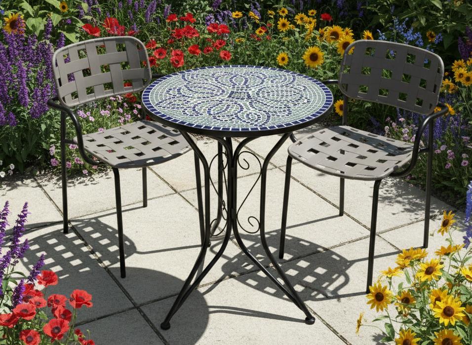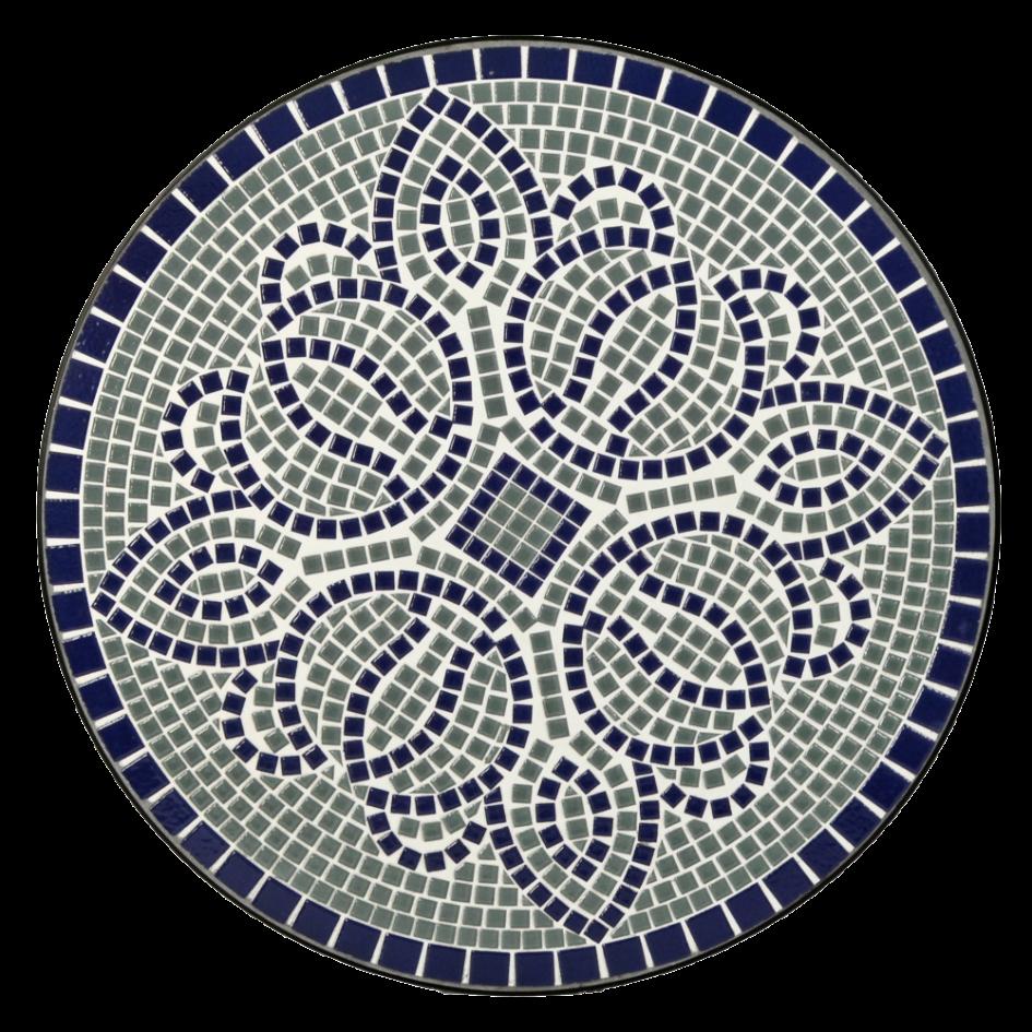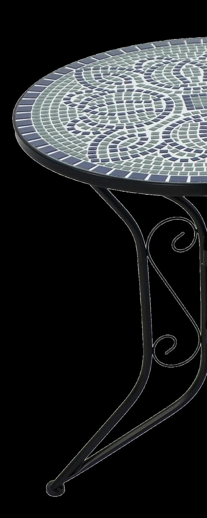 This stylish bistro table features a smooth, handcrafted mosaic top made from a one peice durable ceramic tile in a calming palette of deep navy blue, soft grey-green, and crisp white. The design is an elegant, swirling medallion pattern, adding a touch of sophisticated artistry. Supported by a stable satin black steel base with decorative scrolls, this resilient piece is perfect for injecting a fresh, cool color accent into your patio, sunroom, or balcony decor.