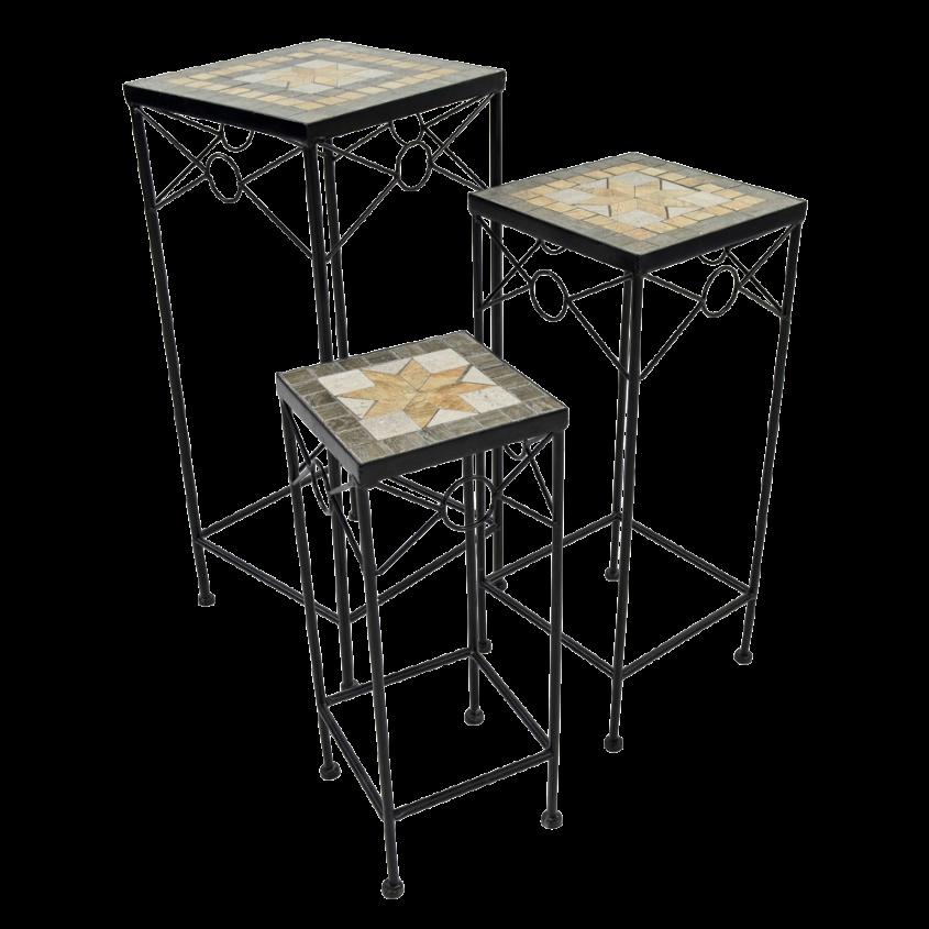 Enhance your decor with the Brava stacking Plant Stands. This hand-crafted set of three mosaic-topped stands features a star motif and sleek steel frames. Ideal for indoor or outdoor use, they offer varying heights for versatile display options and come fully assembled.