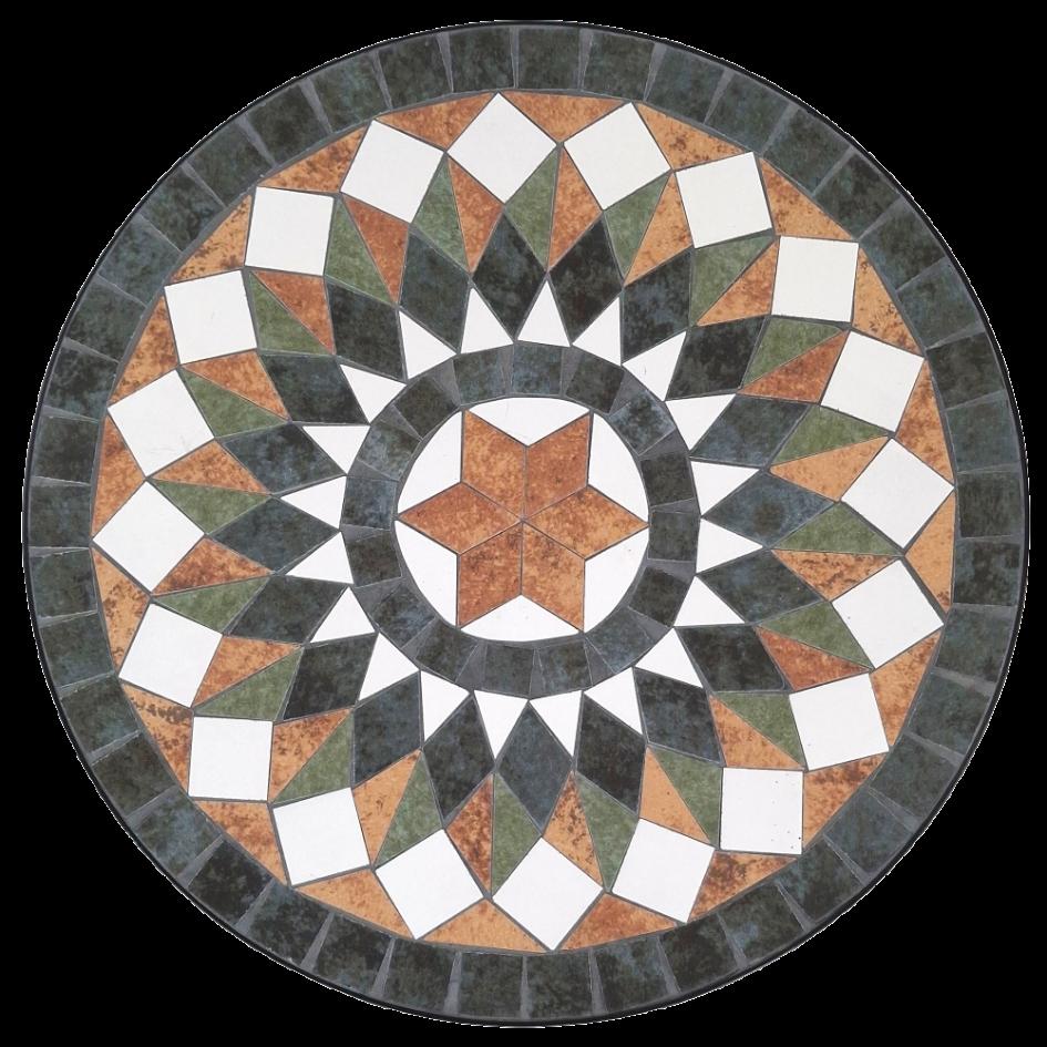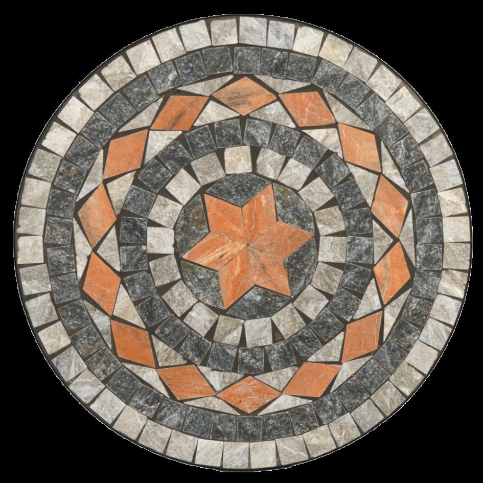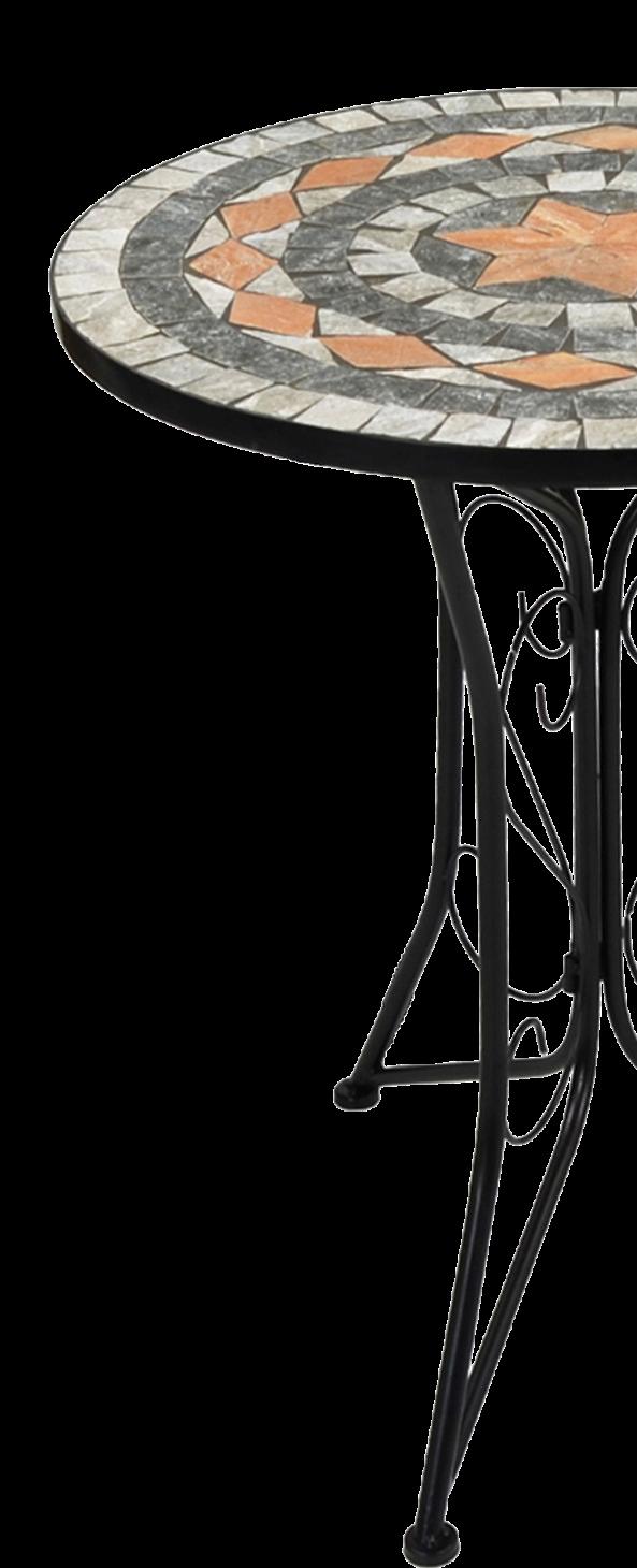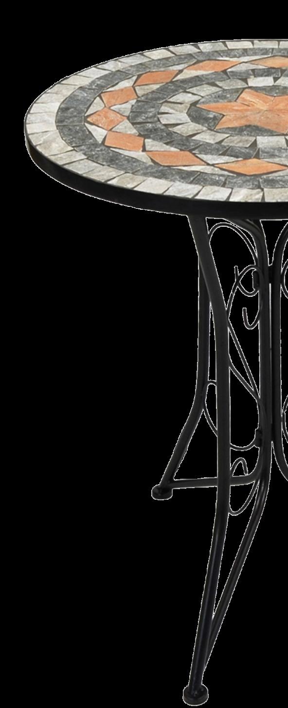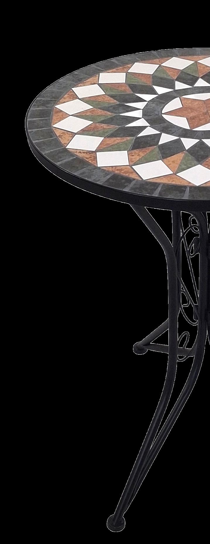 This elegant bistro table features a handcrafted mosaic hand cut tiled top with striking charcoal and light grey slate with vibrant terracotta colours. The intricate geometric design centers around a six-pointed star, creating a warm, Mediterranean aesthetic. It is supported by a satin black steel base with graceful scrollwork, making it a beautiful and resilient accent piece for any indoor or outdoor setting.