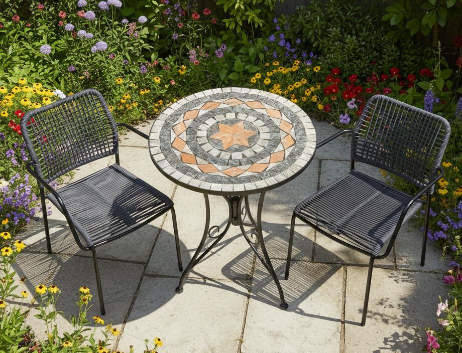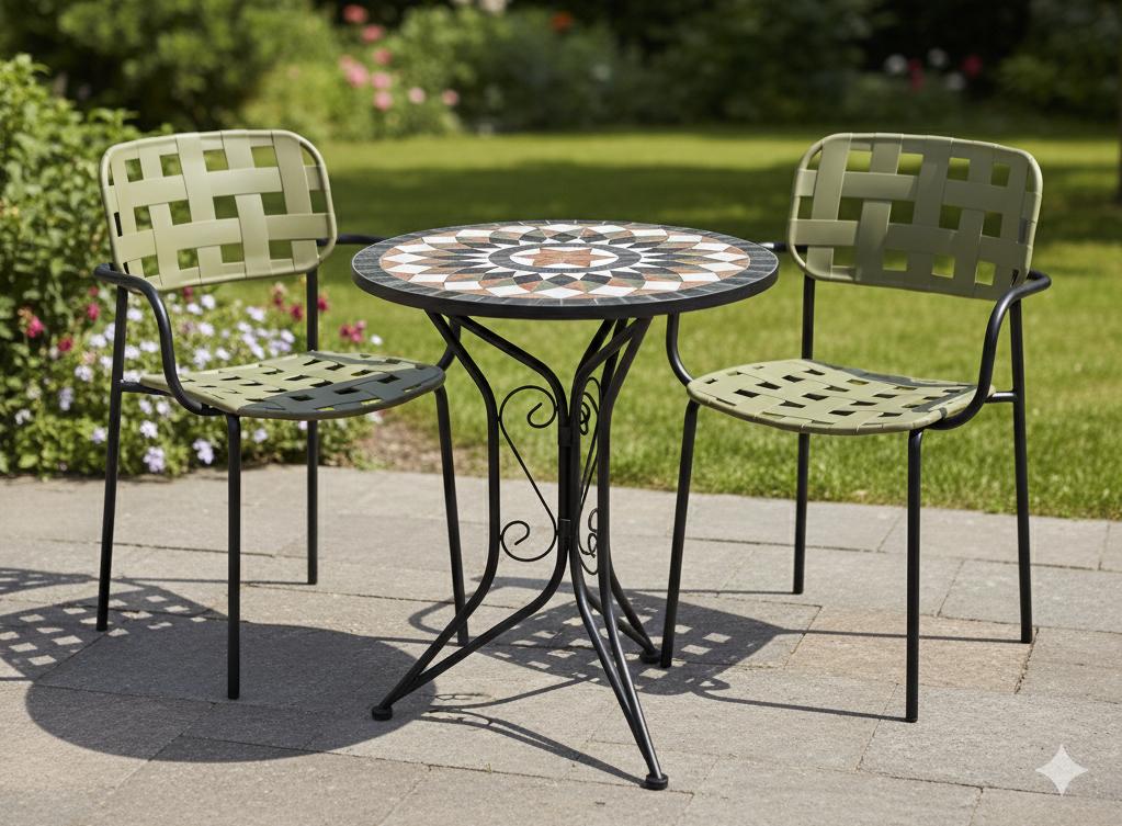The tea for two style bistro table featuring a geometric mosaic design with hand cut tiles in contrasting terracotta, green & white tones. Set into a steel powder coated frame on satin black steel legs which assemble easily with 3 nut and bolts.