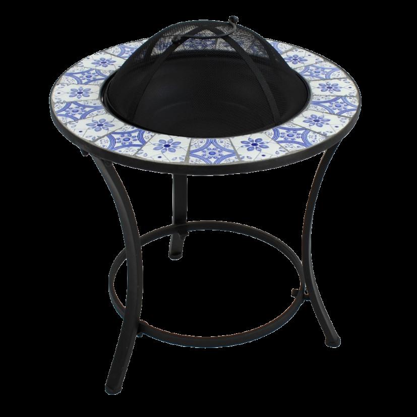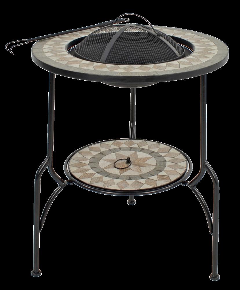 Designed for both warmth and style, these firepits feature a durable, hand cut mosaic rim in sophisticated earthy shades, surrounding a central, deep black metal fire bowl (complete with a mesh safety screen). The entire unit is supported by a sturdy satin black metal frame with gracefully curved legs.