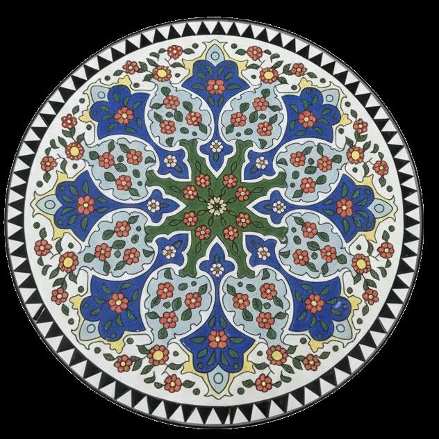 This unique bistro table features a durable one peice tiled top with an exquisitely detailed, Persian inspired medallion design. The vibrant color palette includes striking cobalt blues, forest greens, and cheerful pops of terracotta-orange and yellow in a lush floral motif. The table rests on a satin black steel base with charming scrollwork, making it a functional and beautiful piece of art perfect for adding global elegance to any indoor or outdoor setting.