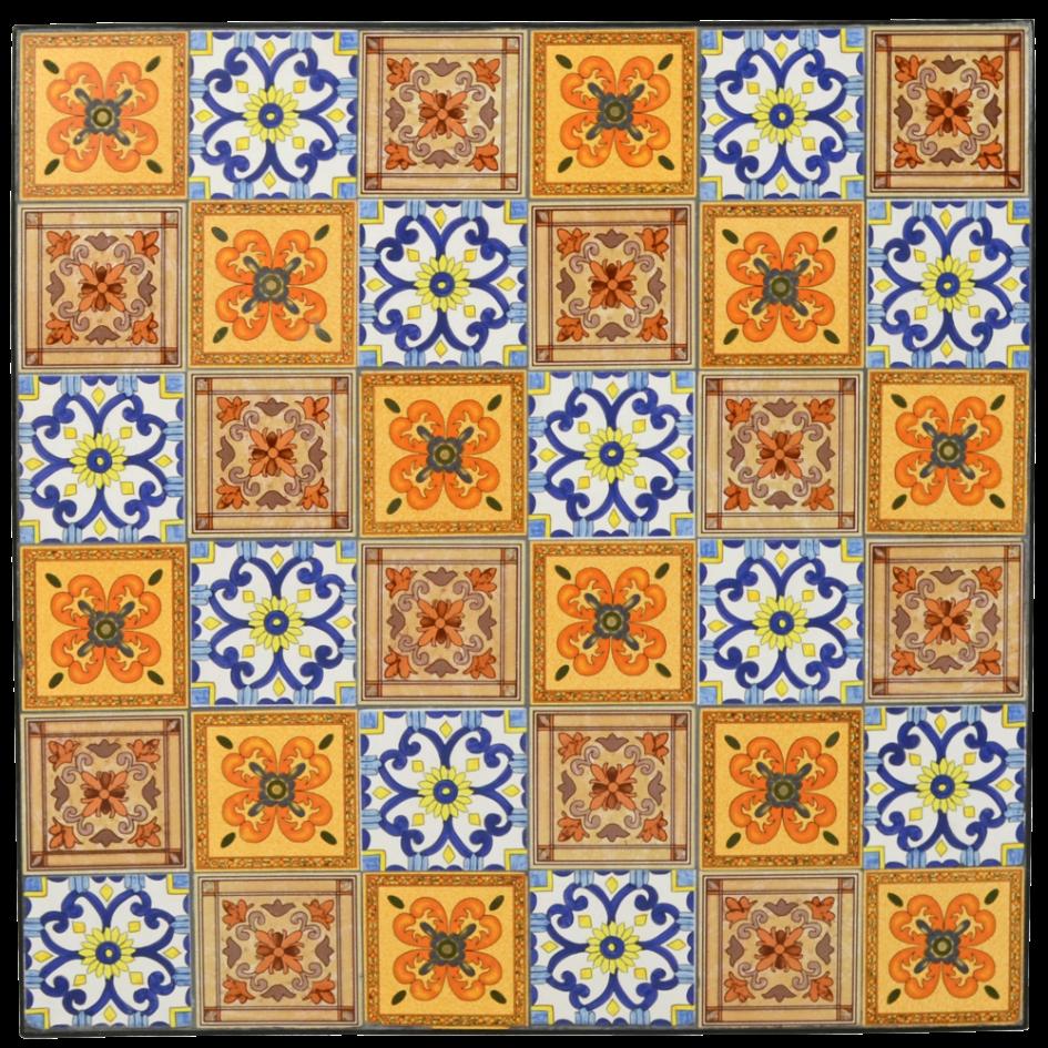 This vibrant square patio table features a durable hand-cut ceramic tiled top, displaying a Mediterranean style floral pattern. The colors are a rich mix of sunny yellows, bright oranges, rust tones, and bold blues. This eye-catching, weather-resistant surface rests on a sturdy satin black metal frame with gracefully curved legs, creating a stylish and inviting spot perfect for enjoying vibrant outdoor dining.