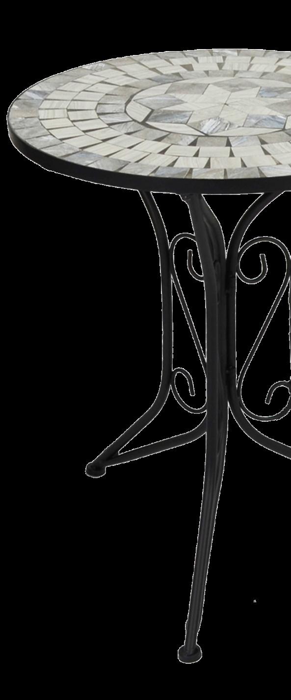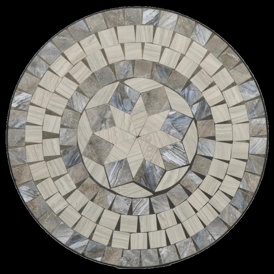 This elegant bistro table features a durable hand cut tiled top, displaying a sophisticated monochromatic design. The colors are a subtle blend of pale grey and off-white, with a central star pattern composed of subtly marbled, textured tiles. This contemporary mosaic rests on a satin black steel base with charming scrollwork, offering a resilient and stylish accent perfect for modern or transitional outdoor spaces.