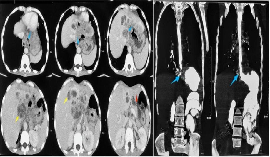 A) Contrast-enhanced CT thorax showed circumferential wall thickening (blue arrows) at gastro-oesophageal junction. Multiple peripherally enhancing mass lesions (yellow arrows) are seen along liver surfaces, with loss of fat plane as well as stomach distensibility (red arrows). B) Oral contrast CT showed fistulous communication at the gastro-oesophageal junction, which was coursing superolaterally up to the right lower bronchus (blue arrows).