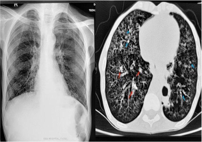 A) Chest radiograph showed fine reticular opacities in the left perihilar region. B) High-resolution CT thorax showed centrilobular nodules (blue arrows) involving both lungs. Cavitatory subsegmental consolidation (red arrows) is seen in the posterobasal segment of the right lower lobe.