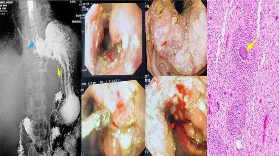 A) Barium swallow confirmed the CT findings of a concentric irregular narrowing (blue arrow) involving the retrocardiac and epiphrenic oesophagus, with proximal barium hold-up. B) Endoscopy revealed that oesophageal mucosa is nodular, with areas of ulceration in the epiphrenic segment (red arrows). Serpiginous tracts and monstrous ulceration were also observed along the lesser curvature of the stomach. At the gastro-oesophageal junction, there were whitish exudates with fistulous communication (red arrow) seen just adjacent to the gastro-oesophageal junction (at a level of 39 cm). C) Biopsies taken from the oesophagus revealed discrete sulfur granules (yellow arrows) consistent with Actinomyces infection, which was confirmed upon histopathological examination.