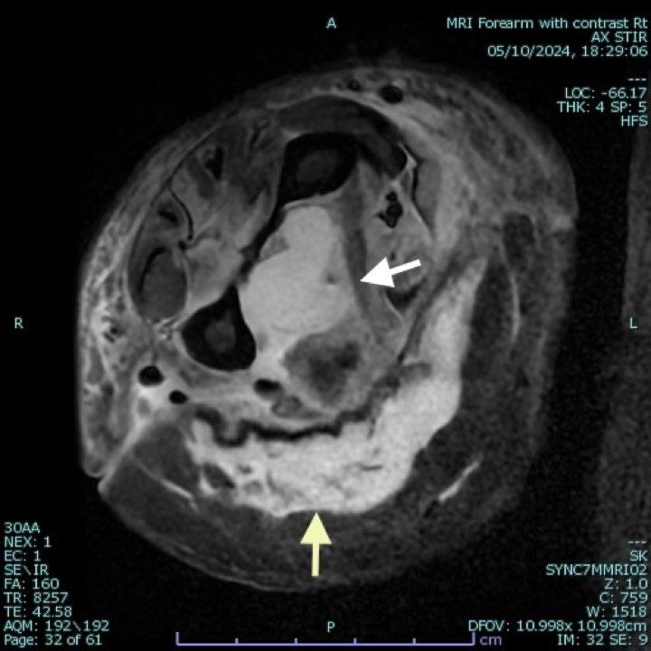 Axial STIR sequence MRI image at the level of the right mid forearm showing extensive high signal change abnormality in the flexure compartment musculature (white arrow) with surrounding subcutaneous oedema (yellow arrow). STIR: short tau inversion recovery.