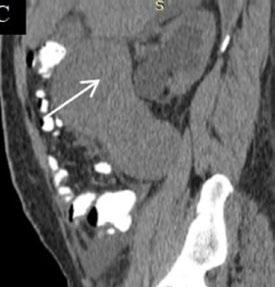As inflammatory markers were high, sepsis management was initiated with broadspectrum antibiotics and fluid resuscitation following blood culture collection, although the source of infection was unclear. A throat swab was taken to identify other potential infection sources. A CT scan of the abdomen and pelvis was performed as ultrasound was not available out of hours, which suggested the possibility of endometritis, though the uterine cavity appeared empty and there were no clinical signs suggesting endometritis. The patient was referred to the medical team for a Doppler ultrasound of her limbs to rule out DVT, and was started on anticoagulation therapy in the interim.