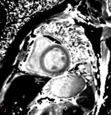 B) SSFP non-contrast two-chamber view, with post-gadolinium soft tissue enhancement around left atrium, and ventricle with minimal intramyocardial enhancement at apical region. C) SSFP three-chamber view, with periaortic soft tissue. D) SSFP post-contrast three-chamber view, with thickened soft tissue enhancement around aortic root. E) SSFP four-chamber white blood image, with hyperintense soft tissue density mass at right atrioventricular groove, around right atrium and ventricle, and pericardial effusion. F) SSFP fourchamber post-gadolinium, with atrioventricular soft tissue enhancement, and diffuse enhancement in the soft tissue around the right atrium and right ventricle. G) SSFP short axis images, with soft tissue thickening around the right ventricle and inferior wall. H) SSFP short axis postcontrast image, with soft tissue enhancement around the right ventricle and inferior wall. I) and J) Pre-contrast short-axis T1 mapping, with regions of interest drawn in the septum native myocardial T1.
