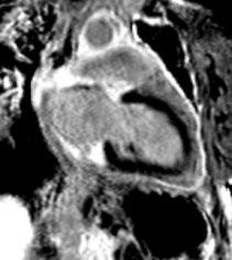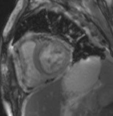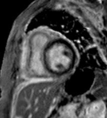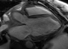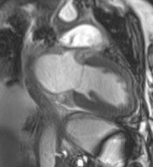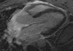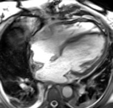 A) SSFP non-contrast two-chamber view, with hyperintense soft tissue around left atrium and ventricle.
